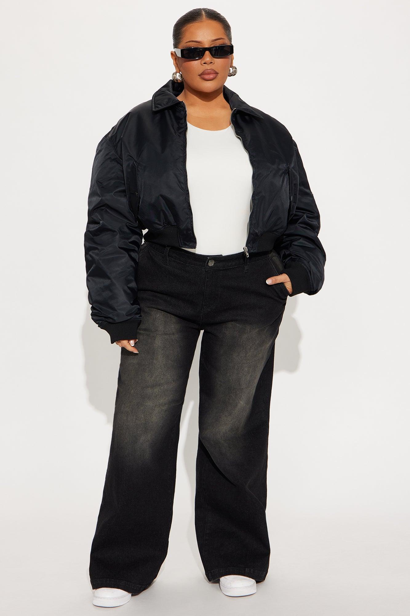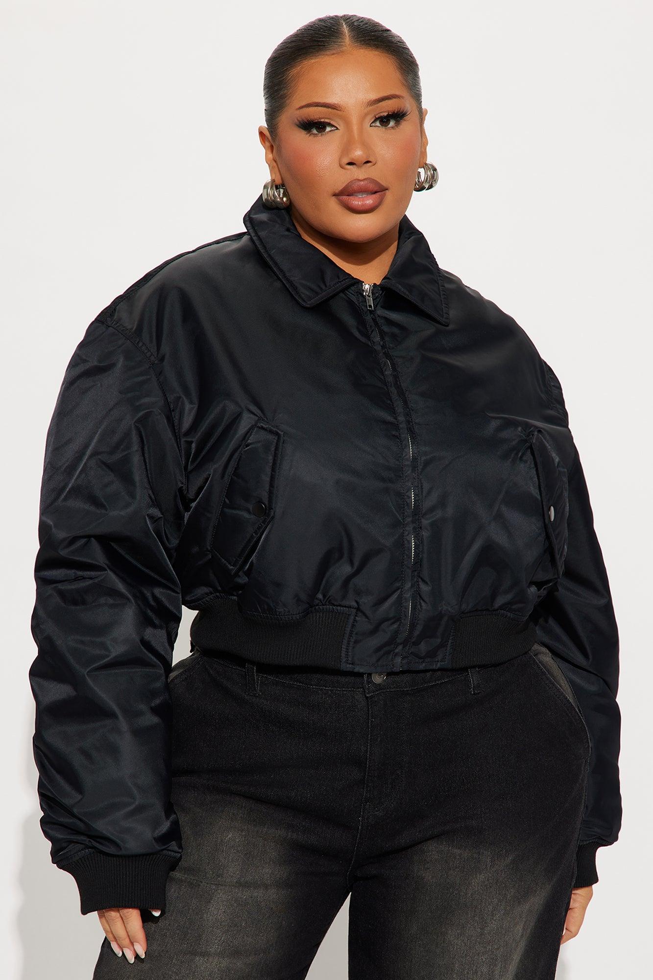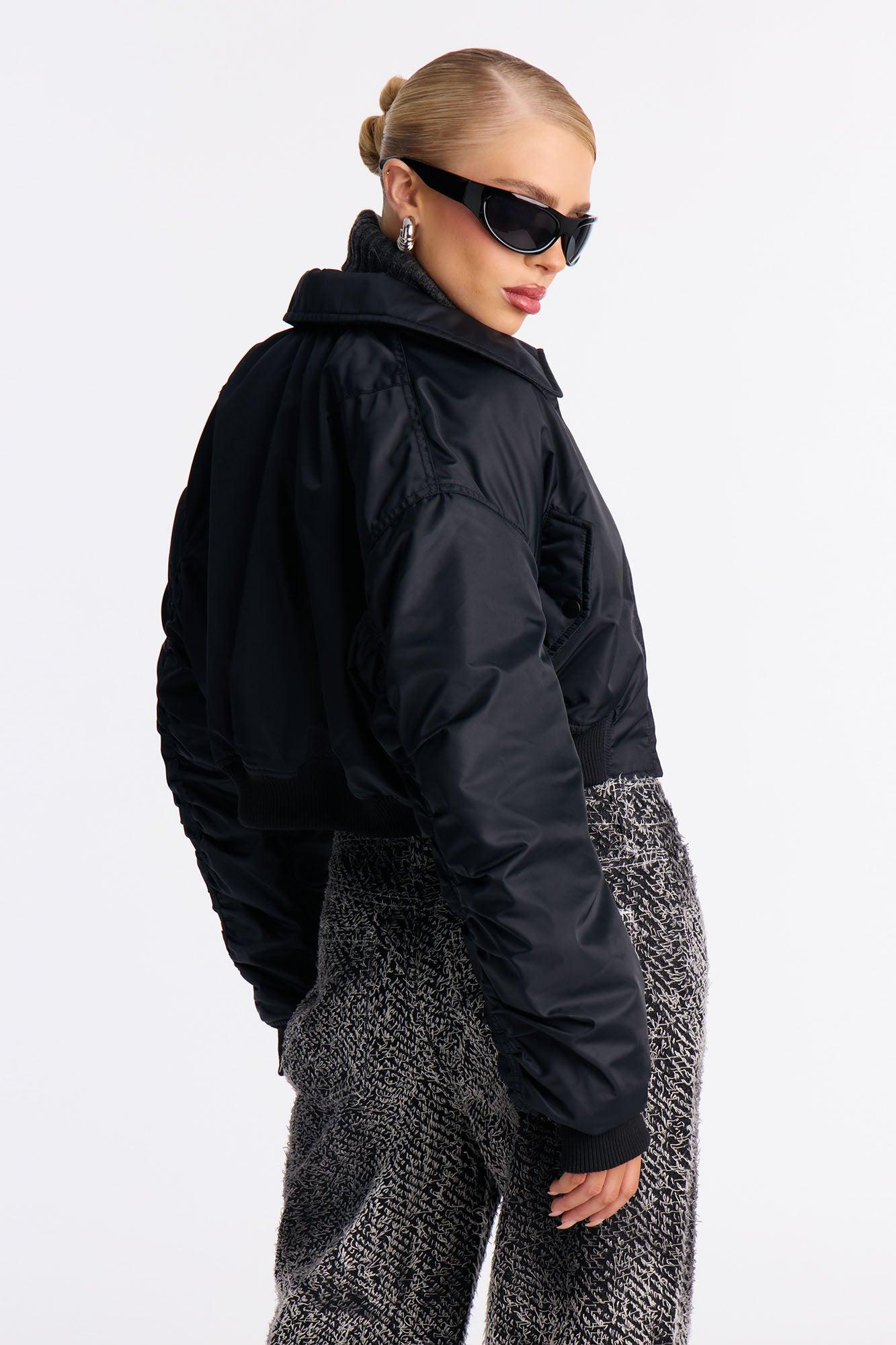Available In Black, Light Grey And Olive. Nylon Blend Bomber Jacket Collar Neckline Long Sleeves W/ Ruching Zipper Pockets Zipper Closure Fully Lined Cropped Self: 100% Nylon Lining: 100% Polyester Filling: 100% Polyester Imported California Proposition 65WARNING: Cancer and Reproductive Harm - www.P65Warnings.ca.gov.