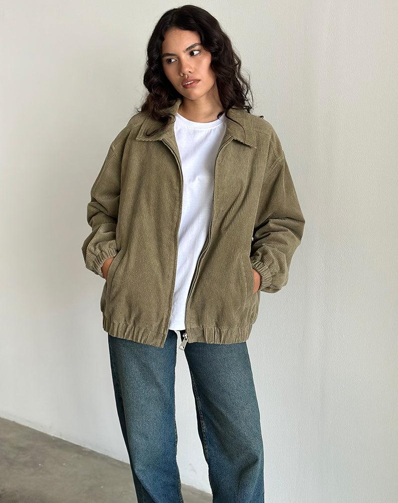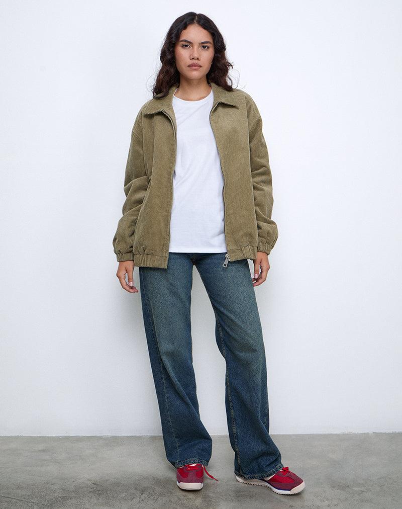 Our Cavita jacket in an artichoke green cord fabric, features an oversized fit, with long cuffed sleeves, collar and zip front fastening with an elasticated hem. Style with a pair of Parallel jeans and the Sakha tee. MODEL WEARS SIZE:EXTRA SMALL - MODEL HEIGHT:5'7