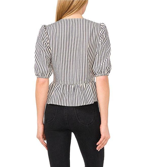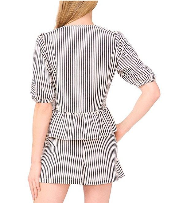 CeCe Coordinating Woven Striped Crew Neck Short Puff Sleeve Tie Peplum Top