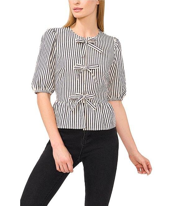 From CeCe, this top features: Woven fabrication Stripe print Crew neckline Short puff sleeves Tie bow front closure Unlined Peplum hemline Approx. 22" in length Cotton Machine wash Imported.