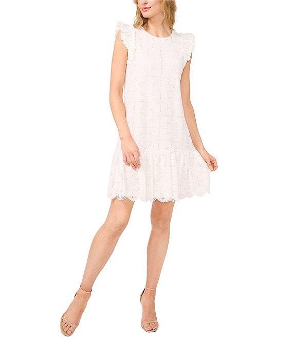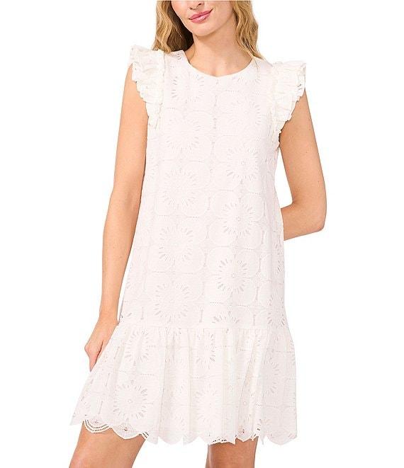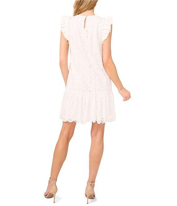 CeCe Floral Lace Round Neck Ruffle Sleeve Shift Dress