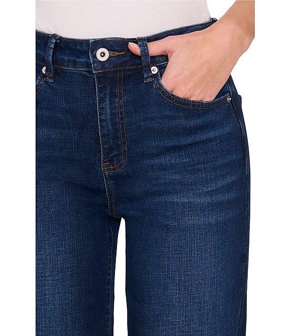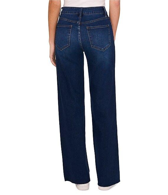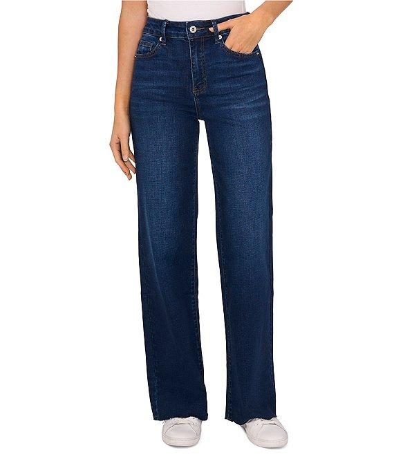 From CeCe, these jeans feature: Wide leg silhouette 5 pocket styling High rise Relaxed fit Full length Straight hemline Front button and zipper closure Approx. 30" inseam Cotton Machine wash/tumble dry Imported.