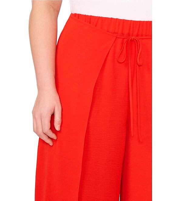 From CeCe Plus, these pants feature: Crinkle twill fabrication Wide leg silhouette Front pleats Asymmetrical hemline Front tie closure Approx. 28" inseam Polyester Machine wash/tumble dry Imported.