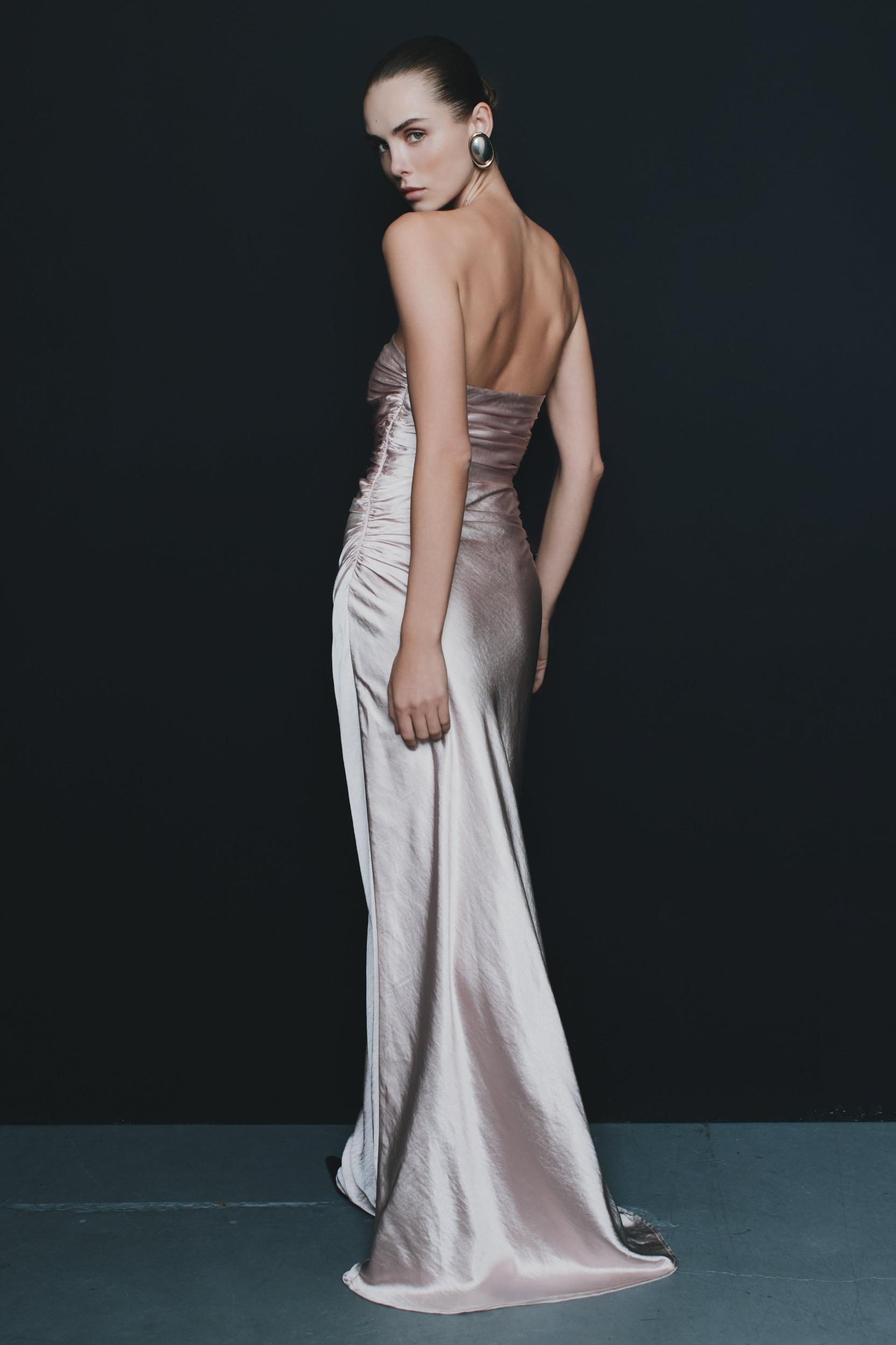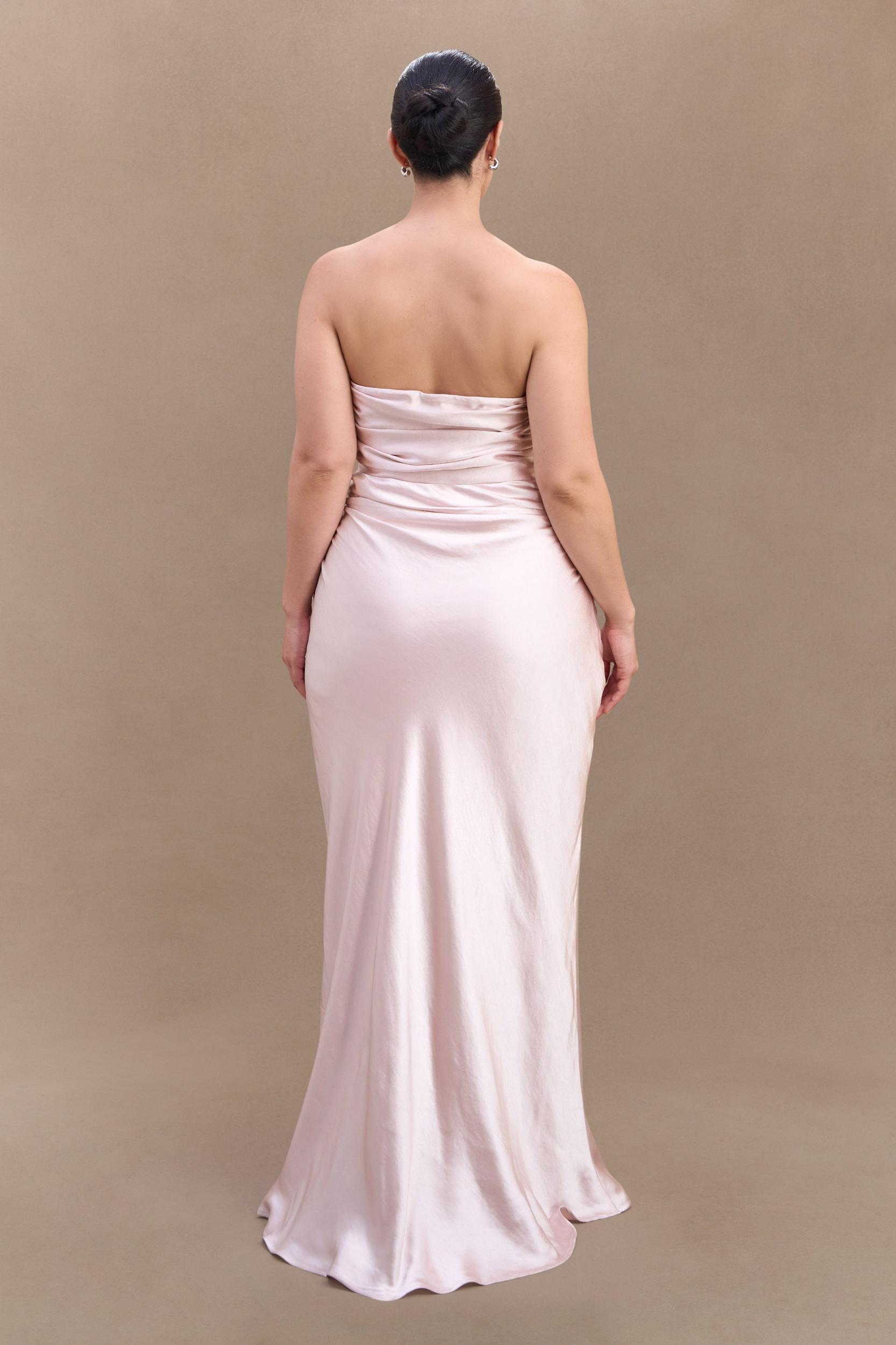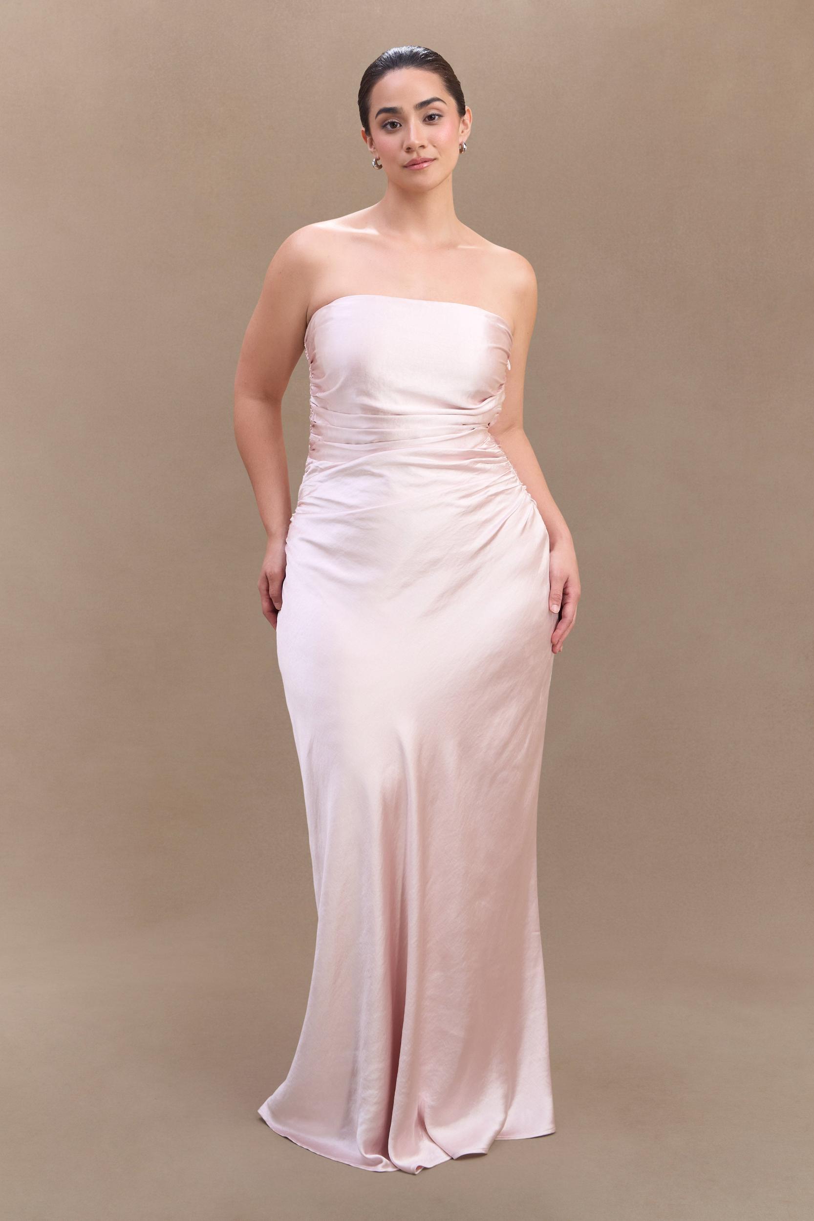 From ceremony to celebration. The CEDAR Strapless Satin Maxi Dress is the perfect blend of timeless grace and modern sophistication. Designed with a sleek strapless neckline, this gown drapes beautifully with side seam gathering that enhances the silhouette. The flowing A-line skirt creates a soft, ethereal movement, while the maxi length exudes understated luxury. Fully lined for a smooth fit and finished with a discreet side zip for seamless wear, this dress is ideal for evening events, weddings, and special occasions that call for effortless refinement.