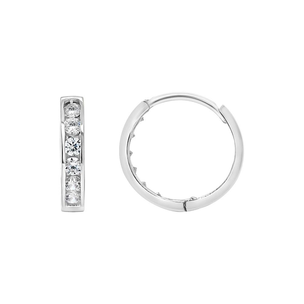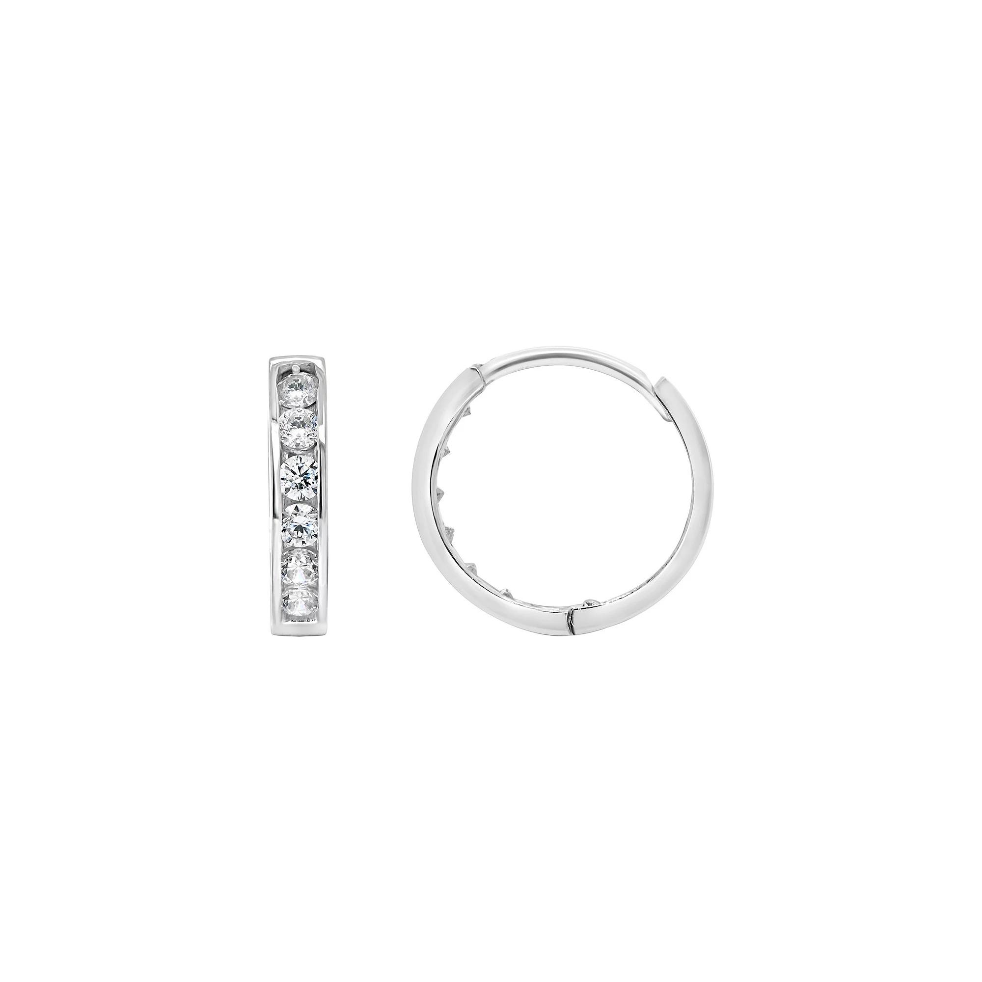 Decorated with dazzling, round-cut cubic zirconia gemstones, these 14k gold huggie hoops are sure to light up your look. Decorated with dazzling, round-cut cubic zirconia gemstones, these 14k gold huggie hoops are sure to light up your look. Length: 3/8 in. Backings: click-it Metal: 14k gold Plating: rhodium Finish: polished Packaging: boxedSTONE DETAILS Stone type: cubic zirconia Total weight: 1/4 ct. Shape: round brilliant Setting: channel Size: One Size. Color: White. Gender: female. Age Group: adult.