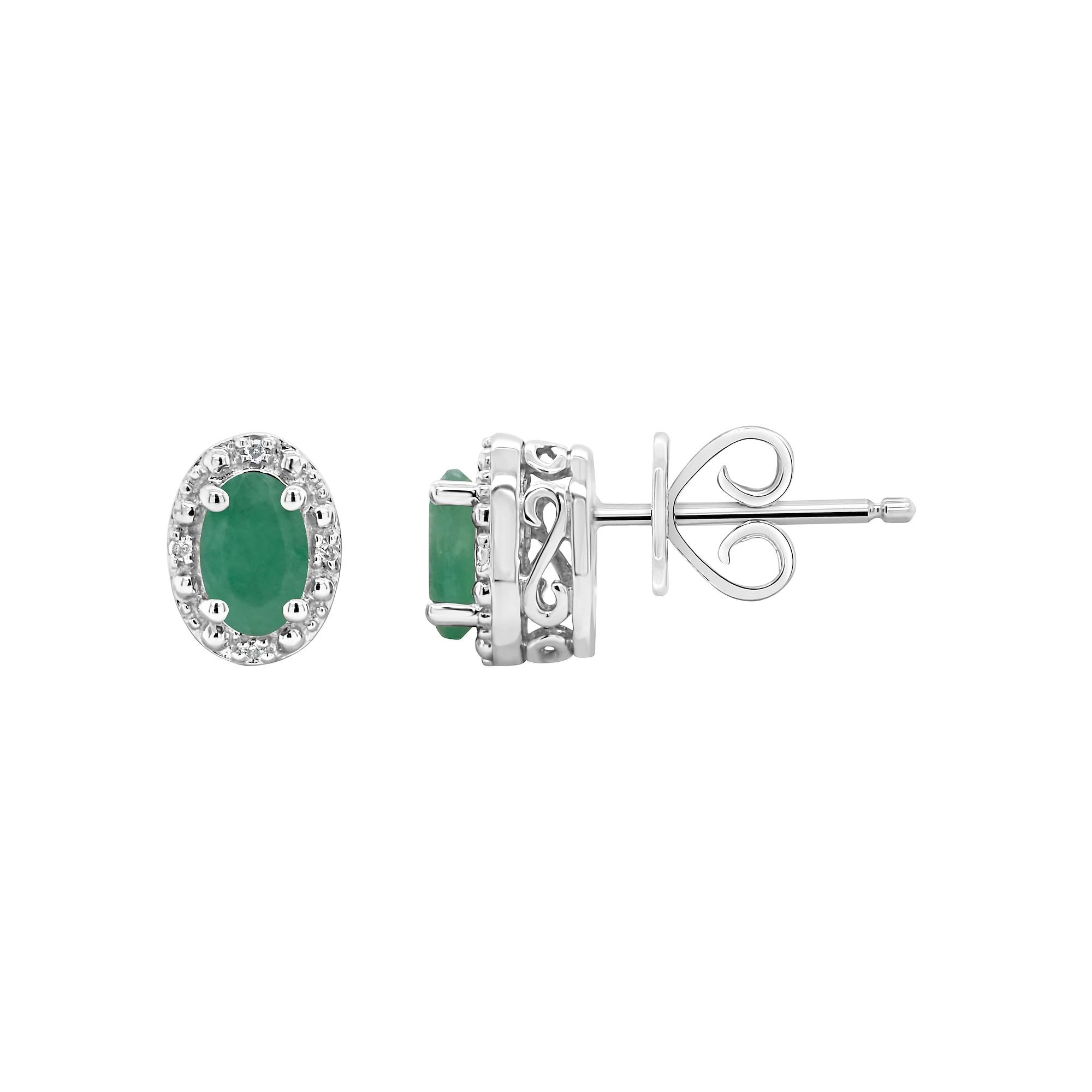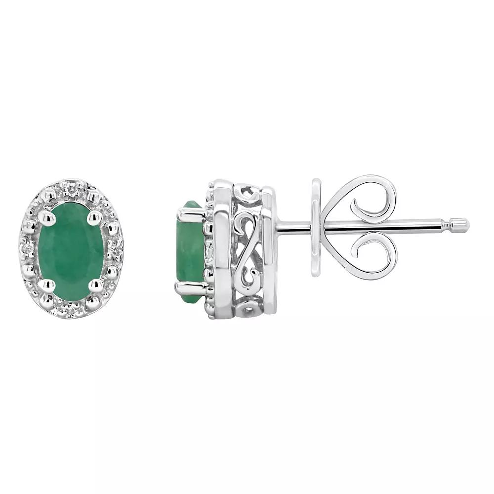 Youll love the impressive design of these sterling silver stud earrings. Length: 9 mm Backings: post Base material: sterling silver Plating: rhodium Finish: polished Packaging: boxed Additional details: nickel free STONE DETAILS Type: emerald Total weight: 9/10 ct. Center stone size: 6 x 4 mm Color: green Shape: oval Setting: prong DIAMOND DETAILS Total weight: less than 1/10 ct. Clarity: I2, I3 Color grade: H, I Diamond weights are approximate. Diamond total weights may vary between .01 and .08 ct. Some diamonds have fewer than 17 facets. Gemstones may have been treated to enhance their appearance. Special care may be required. Please visit our Gemstone Treatment & Special Care Guide for more information. Image(s) may be enlarged to show detail. Gender: female. Age Group: adult.