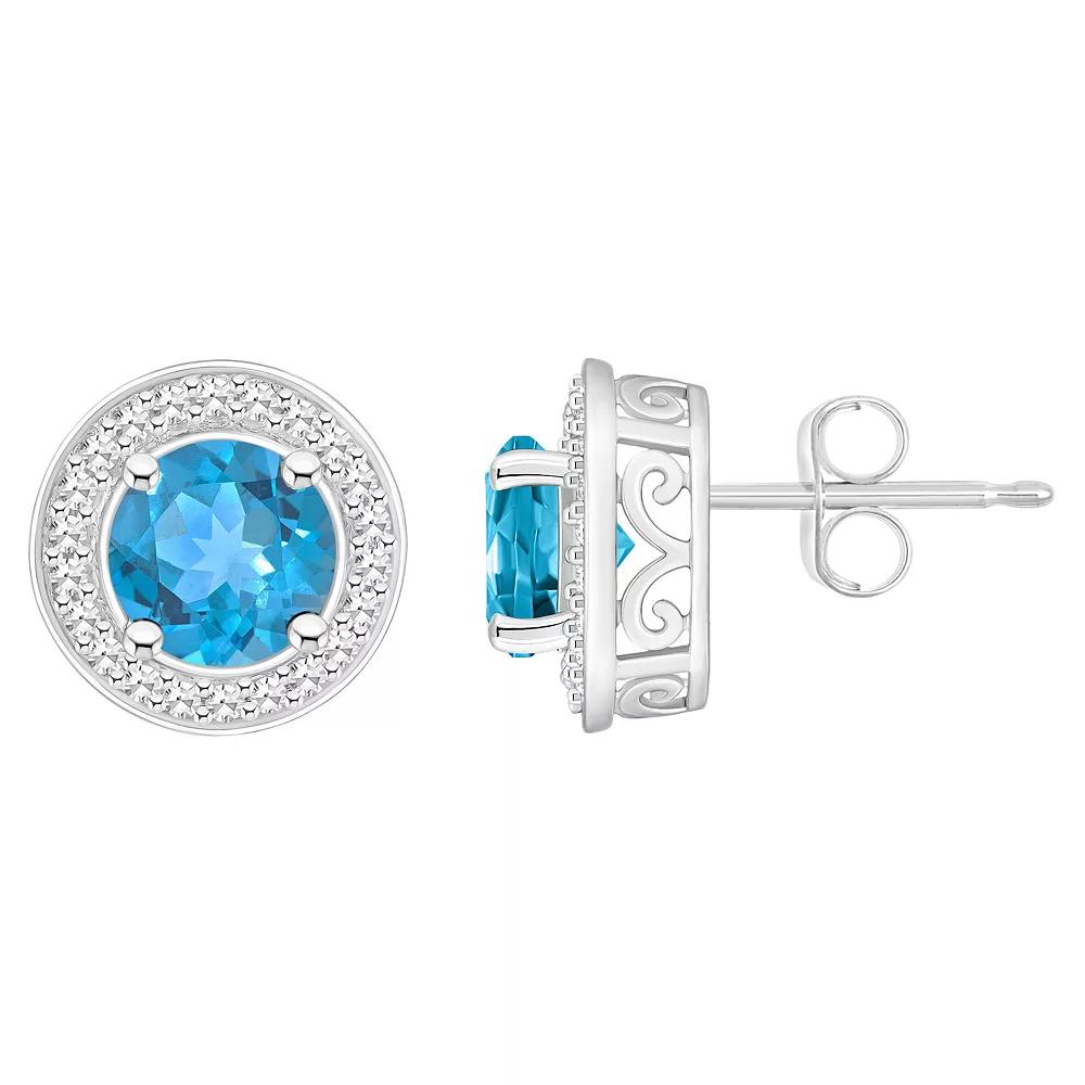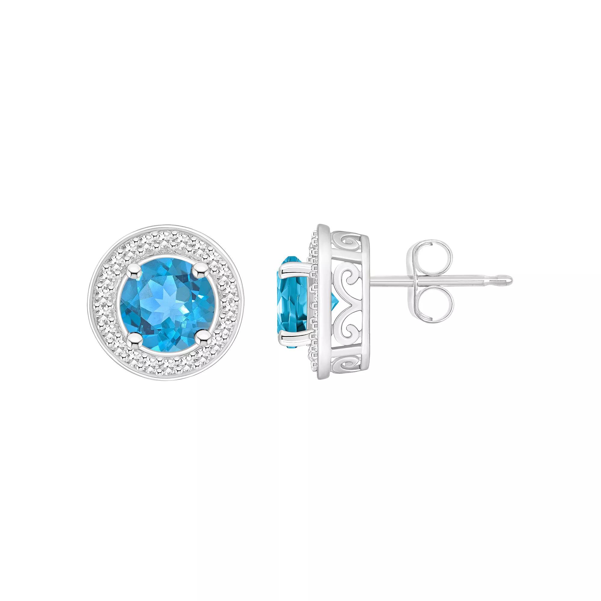 Adorned with colorful gemstones set in a halo of shimmering, round-cut diamonds, these Celebration Gems stud earrings are a perfect complement to your favorite outfits. Adorned with colorful gemstones set in a halo of shimmering, round-cut diamonds, these Celebration Gems stud earrings are a perfect complement to your favorite outfits. Length: 2/5 in. Backings: post Nickel free Metal: sterling silver Plating: rhodium Finish: polished Packaging: boxedSTONE DETAILS Center stone size: 6 mm Shape: round Setting: prongDIAMOND DETAILS Total weight: 1/5 ct. Shape: round Setting: prong Gemstones may have been treated to enhance their appearance. Special care may be required. Please visit our Gemstone Treatment & Special Care Guide for more information. Image(s) may be enlarged to show detail. Please note, due to the high value of this item, a signature may be required upon delivery. Color: Blue. Gender: female. Age Group: adult.