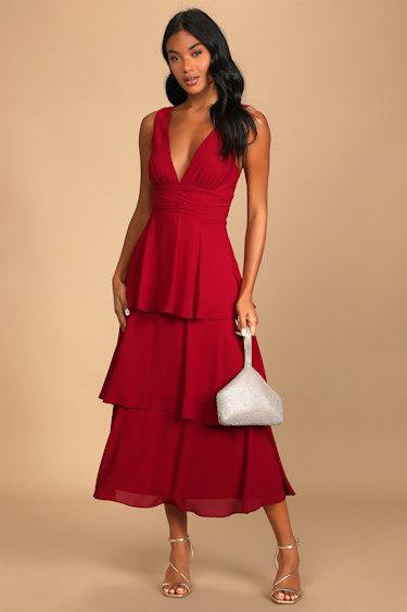 One midi you won’t wanna missThis stunning little dress was made to catch compliments with an airy chiffon fabrication that forms a sleeveless bodice, a V-neckline, and a perfectly fitted waist. Tiered skirt falls to a RSVP-ready mini hem. Hidden side zipper/clasp.
