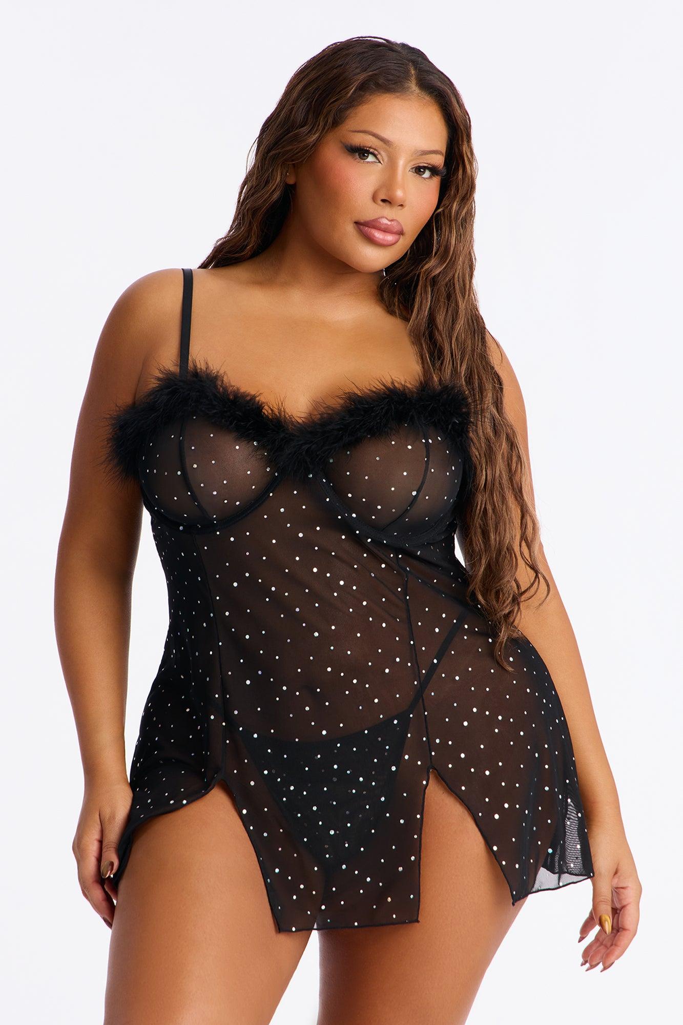 Available In Black. Rhinestone Mesh Chemise Feather Trim Rhinestone Embellished Detail Adjustable Straps Unlined Underwire Bow Detail Side Slit Detail Matching Thong Panty Final Sale Shell: 95% Polyester 5% Spandex Decoration: 100% Ostrich Feathers Imported