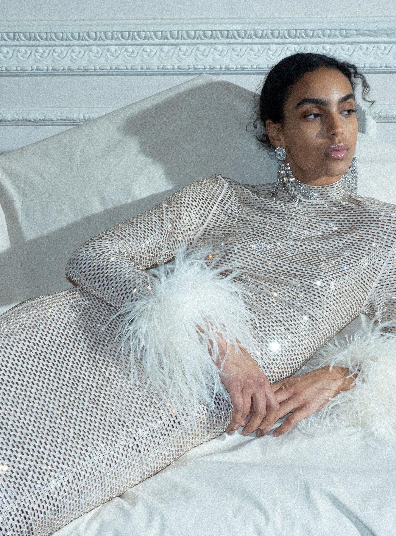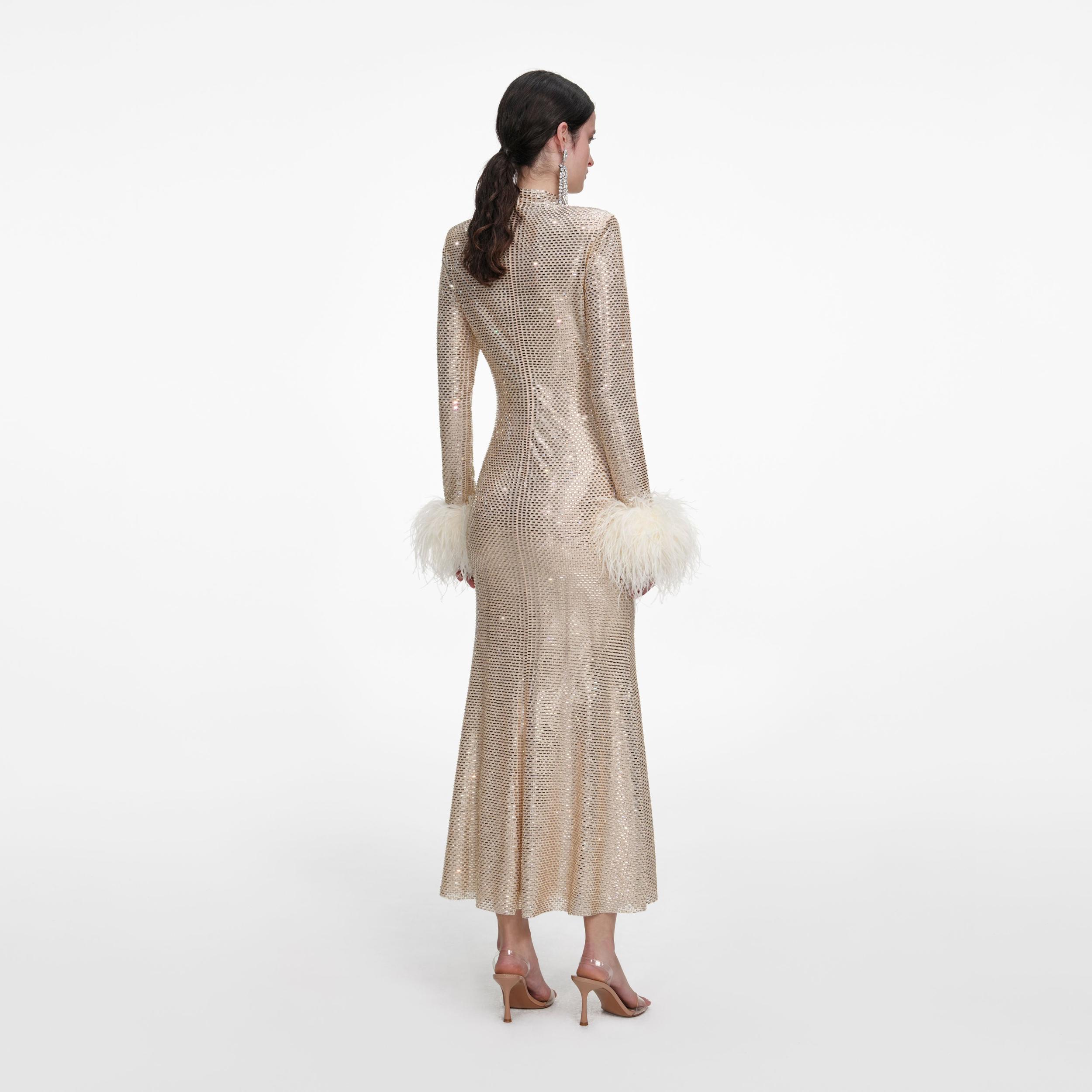 Calling all champagne lovers: this slinky midi dress stars all-over rhinestone embellishments and dramatic feather cuffs in a liquid gold hue. Style with sky-high heels for a night to remember.Runs small, we recommend sizing up for the best fit. Fabric has stretchConcealed zip closure at backShoulder padsFeather cuffsModel is 5ft10/178cm and wears a size UK 6