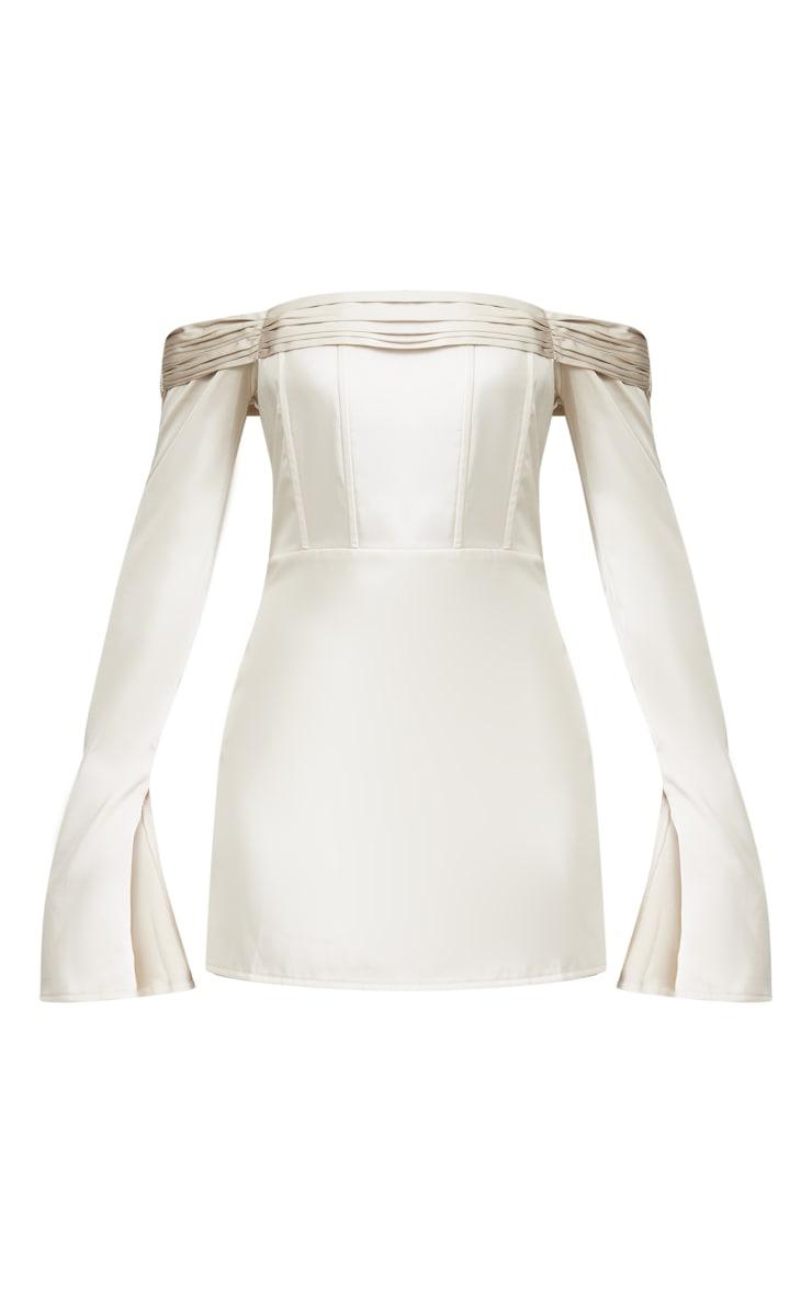 Exude elegance in this champagne satin pleat detail bardot flared sleeve shift dress. Brought to you in champagne hue satin, this dress has pleat detailing, a bardot neckline and a mini length fit. Wear it with neutral toned strappy heels and gold earrings for an enhanced look. Length approx 58.5cm/23inch (Based on sample size US 4)Model wears size UK 8/ EU 36/ AUS 8/ US 4Model Height - 5ft 10inchp]:!mb-4inch>Brand: PrettyLittleThingCategory: DressesProduct type: Shift DressColor: ChampagneMaterial: SatinDesign: PlainNeckline: BardotOccasion: Evening