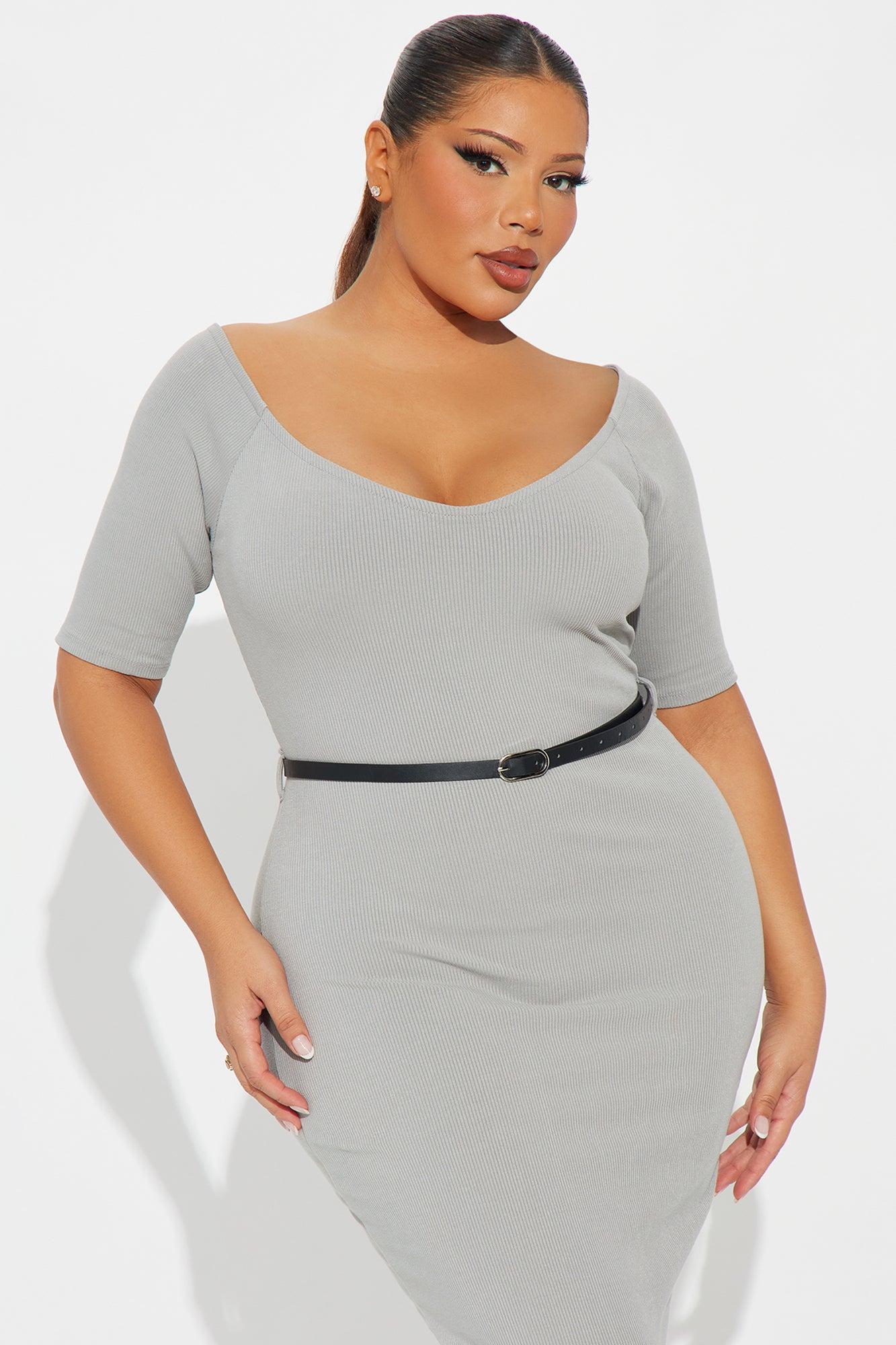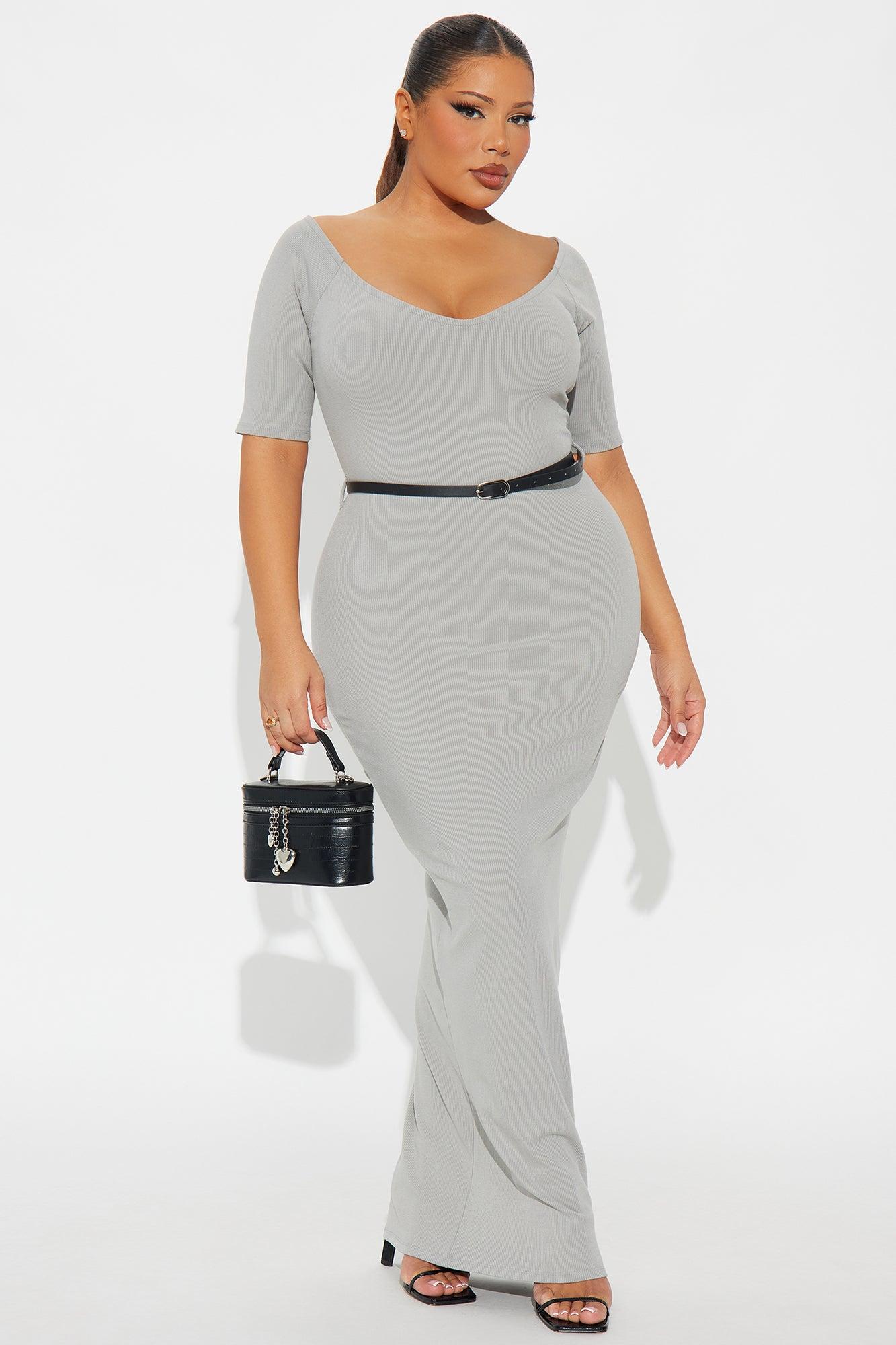 Available In Black, Butter Yellow And Grey. Maxi Dress V-Neck Off Shoulder Short Sleeve Detachable Belt Stretch Compression Rib Self: 88% Rayon 12% Spandex Imported California Proposition 65WARNING: Cancer and Reproductive Harm - www.P65Warnings.ca.gov.