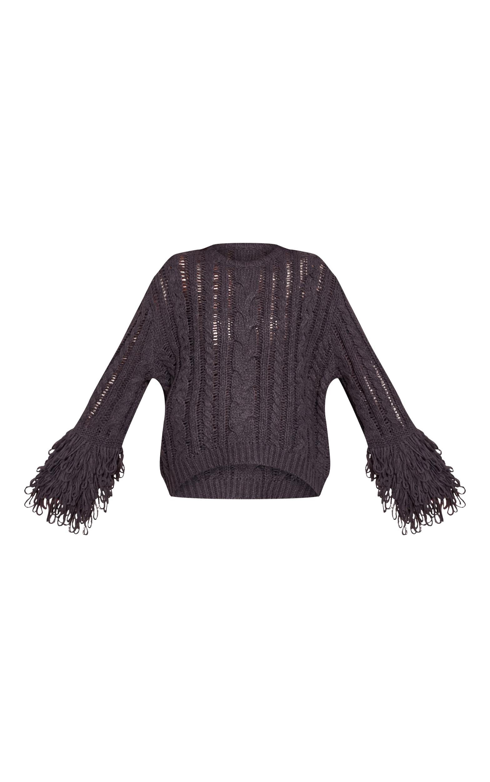 Master the art of relaxed dressing with a piece that blends intricate detail with confident ease. The charcoal cable knit loop trim sweater offers a fresh perspective on essential knitwear, showcasing a sophisticated mix of classic cable patterns interspersed with artful ladder detailing across its body and voluminous sleeves. Its distinctive loop trim cuffs add an unexpected, directional flourish, creating dynamic movement that sets this sweater apart. This relaxed-fit charcoal knit, with its effortless round neckline, pairs perfectly with sleek tailored pants for an elevated day look, or team it with dark wash denim for a more understated aesthetic. Ground your ensemble with on-trend cowboy boots and some delicate pearl earrings, curating an edit that speaks volumes in self-assured style.Length approx 48.5cm/19inch (Based on sample size S)Model wears size SModel Height - 5ft 7inchp]:!mb-4inch>Category: KnitwearProduct type: Oversized SweaterColor: CharcoalMaterial: KnitOccasion: Day