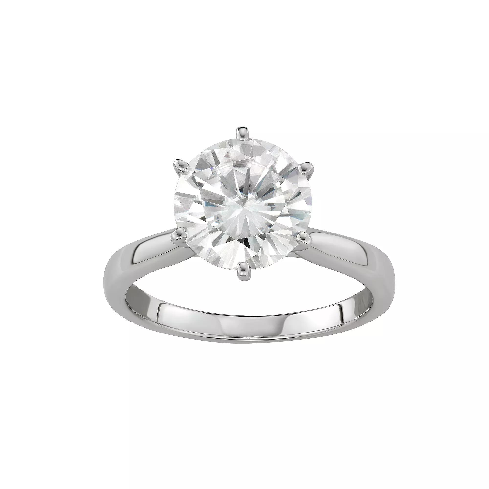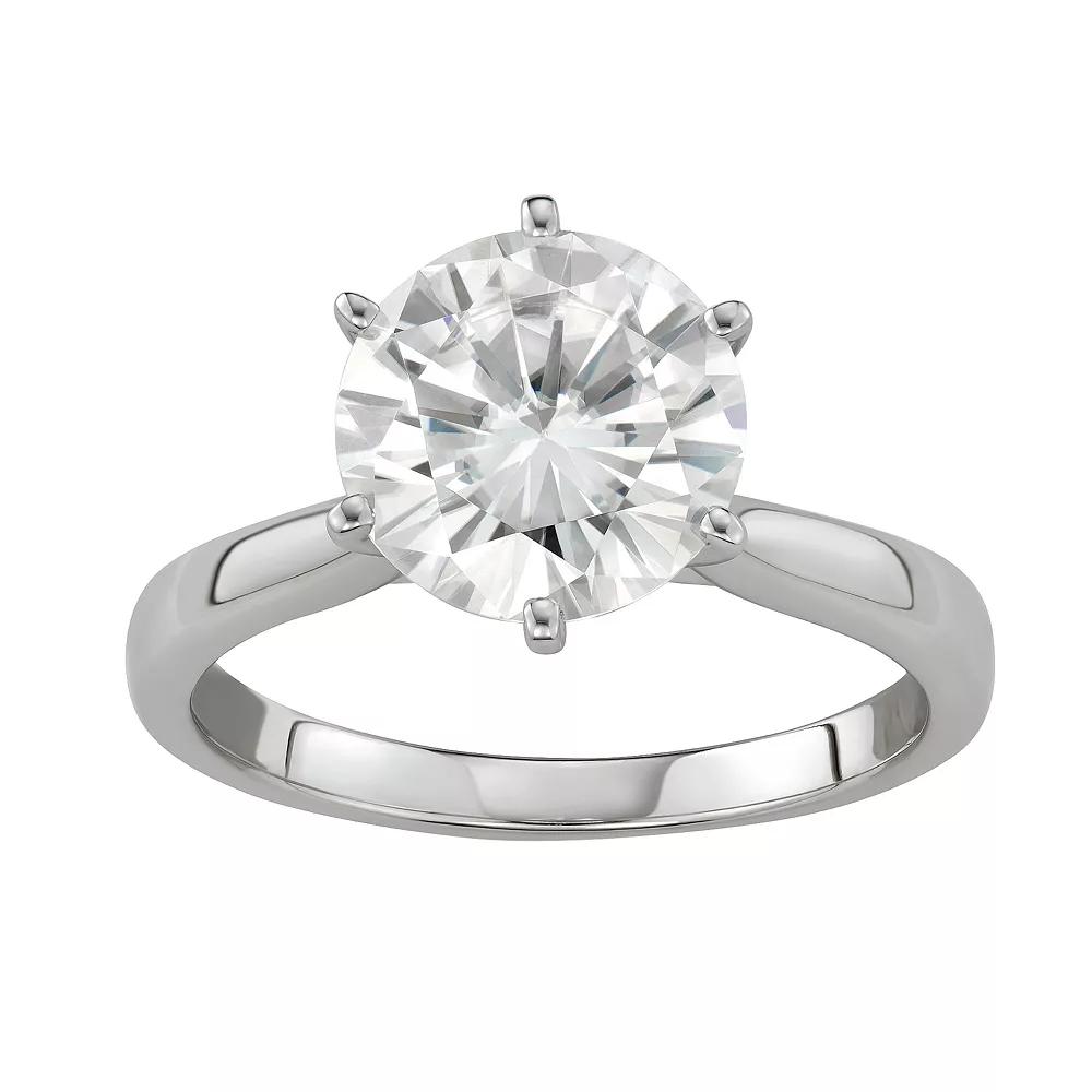 Heads will turn with this alluring Moissanite by Charles & Colvard solitaire engagement ring. Created in 14-karat white gold, this stunning ring showcases a gleaming 9.5-millimeter round-cut stone that is elegantly displayed in a six-prong setting. This 3.10-carat total weight ring will make all of her dreams come true. | Charles & Colvard 3.1 Ct. T.w. Lab Created Moissanite Solitaire Ring In 14K White Gold, 6