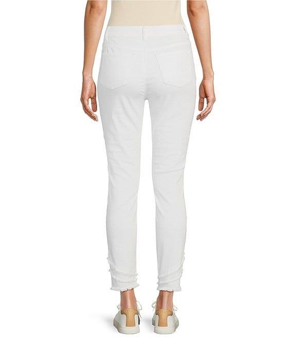 From Charlie B., these pants feature: Straight leg silhouette Slim fit Mid rise Belt loops 5 pocket styling Slim Fit Ankle length Frayed hem Front zip and button closure Approx. 28"length Cotton/twill Machine wash/line dry Imported.
