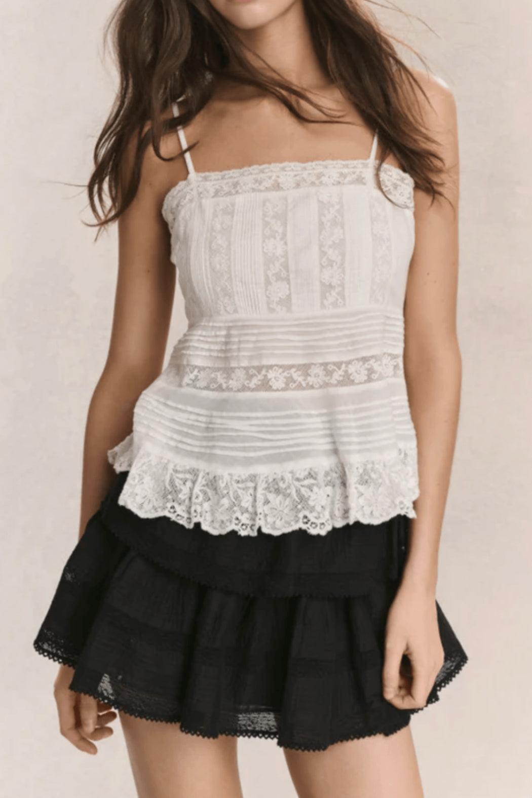 Living in our Charlieann Top. This stunning top is an update to our forever favorite Victorians featuring delicate pintucks and diagonal chevron lace details all over. The easy cami top begins with thin spaghetti straps before falling to its lovely peplum silhouette that has a sweet fit at the waist. The top is finished with a side seam zipper.