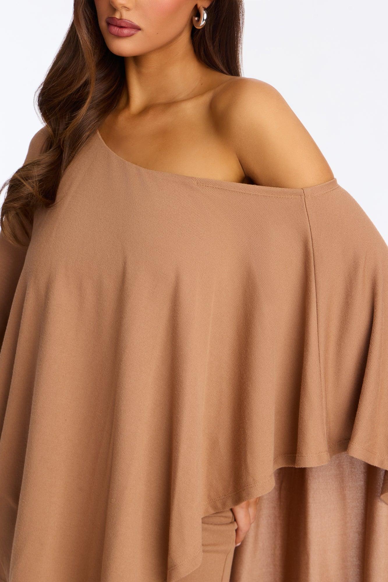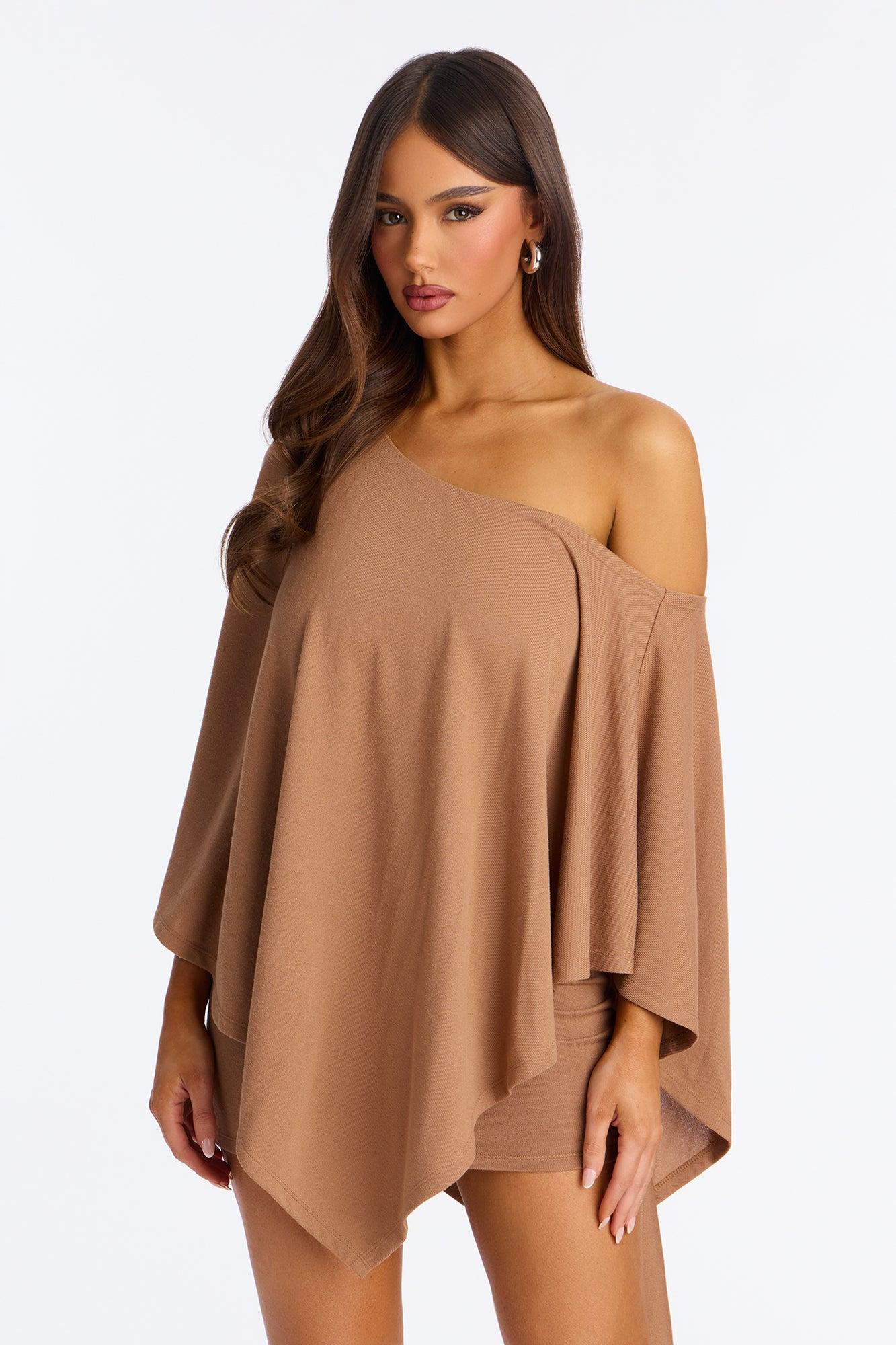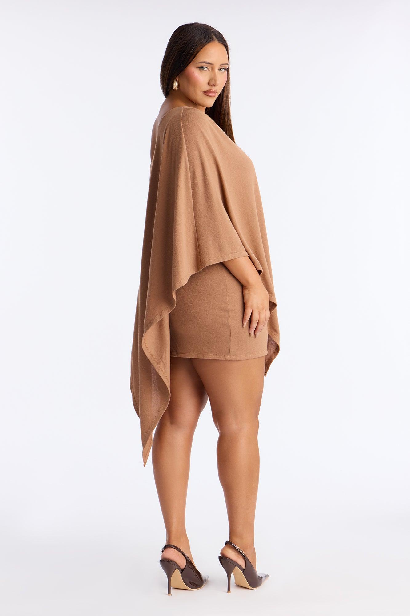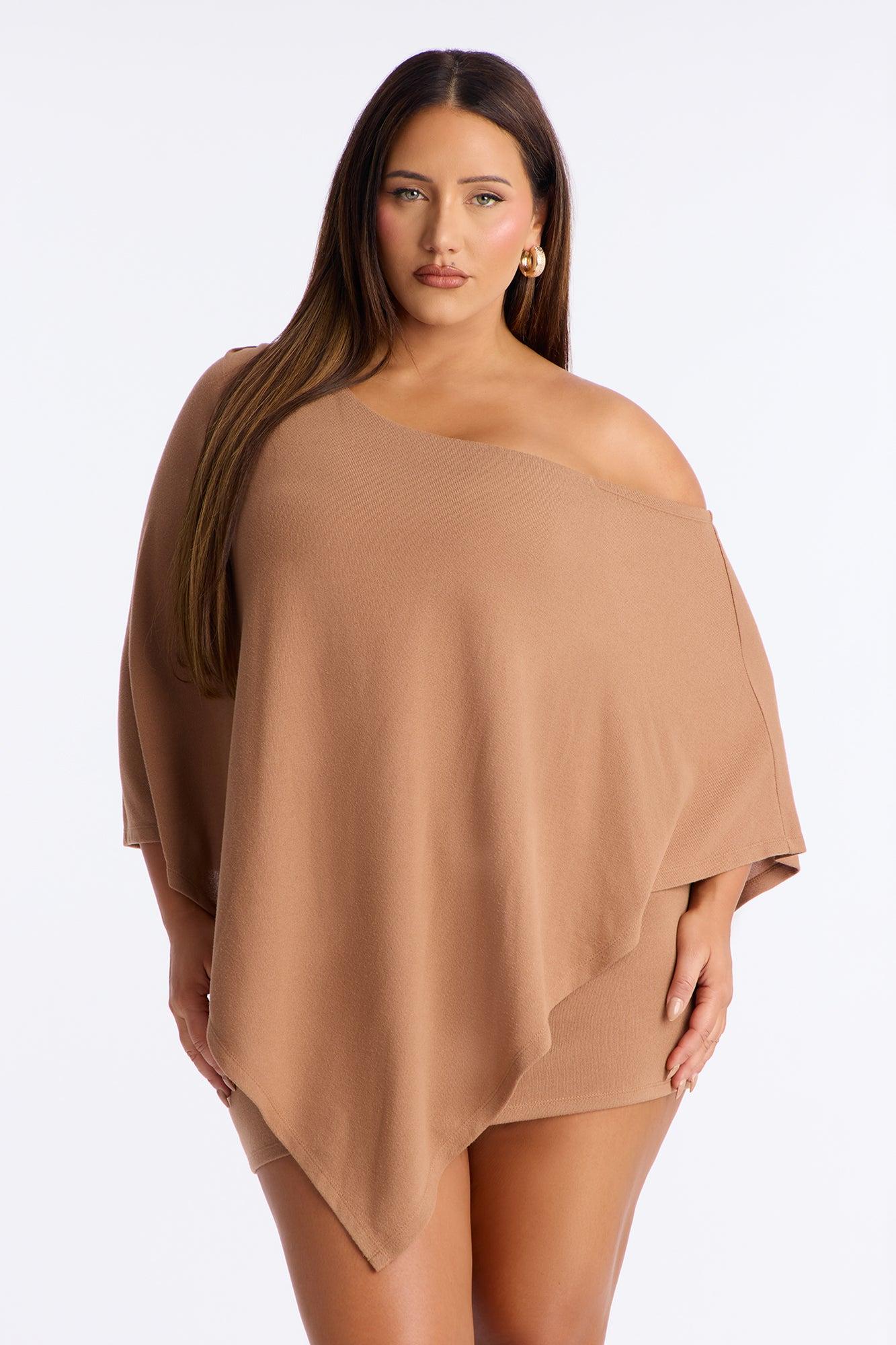 Available In Brown. Sweater Mini Dress One Shoulder Sleeveless Cape Asymmetrical Hem Stretch Length Measured Flat = 31" Self: 95% Polyester 5% Spandex Imported