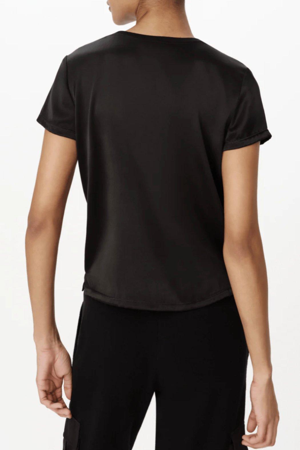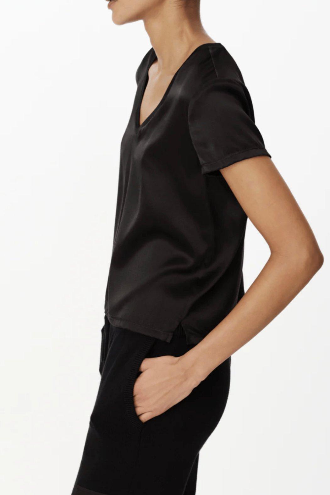 The Stretch Charmeuse V-Neck Tee is a fitted and fluid silhouette constructed with slight stretch for extra comfort. It is finished with a silky sheen, flat neckband, sleeves and, hem with short side slits.