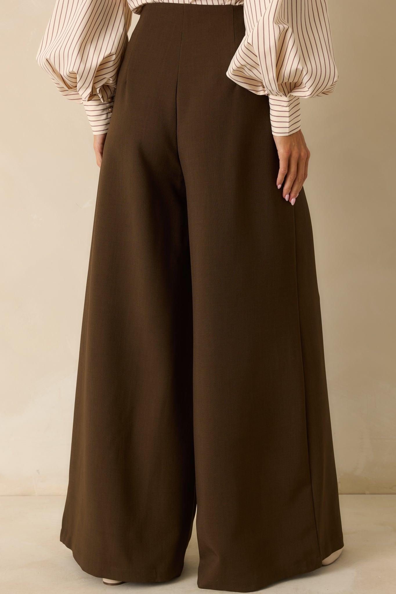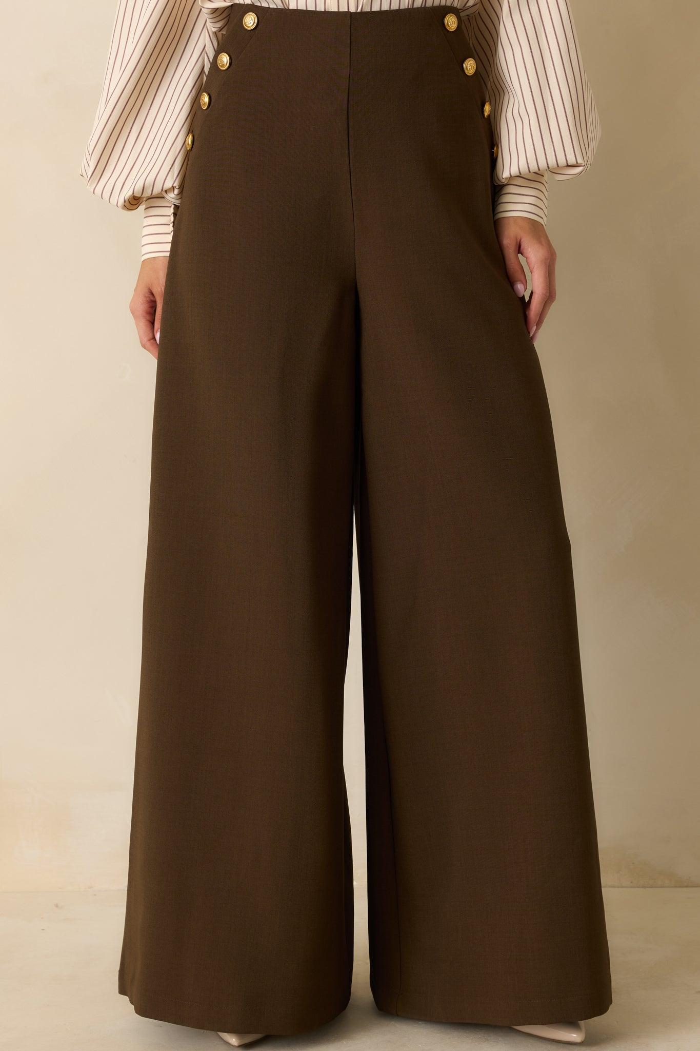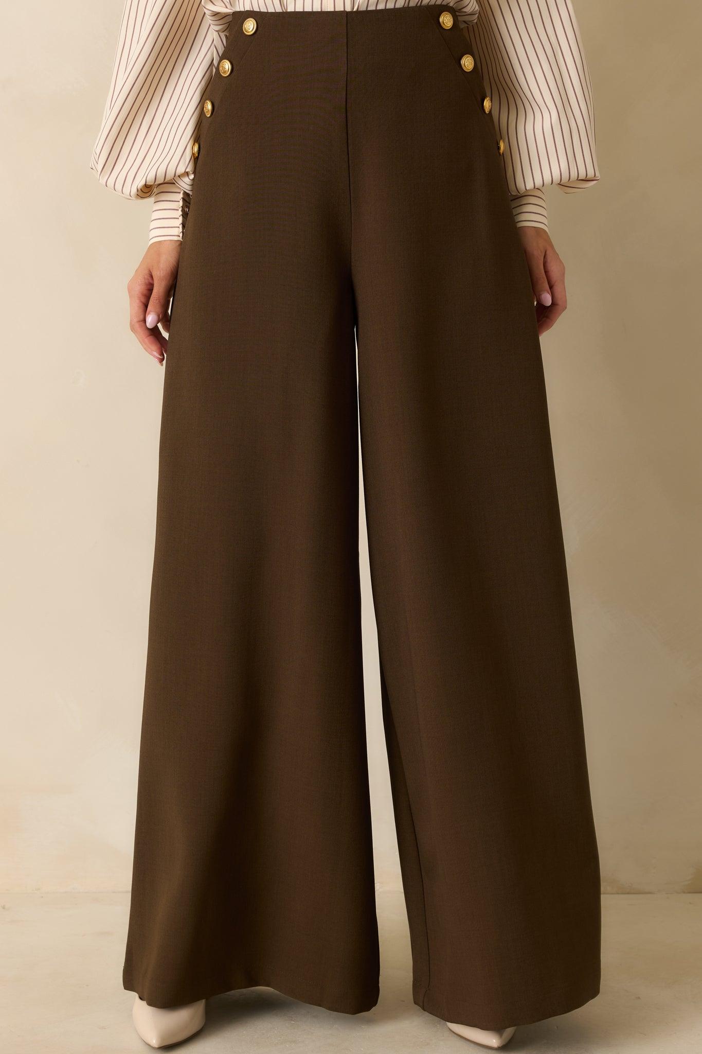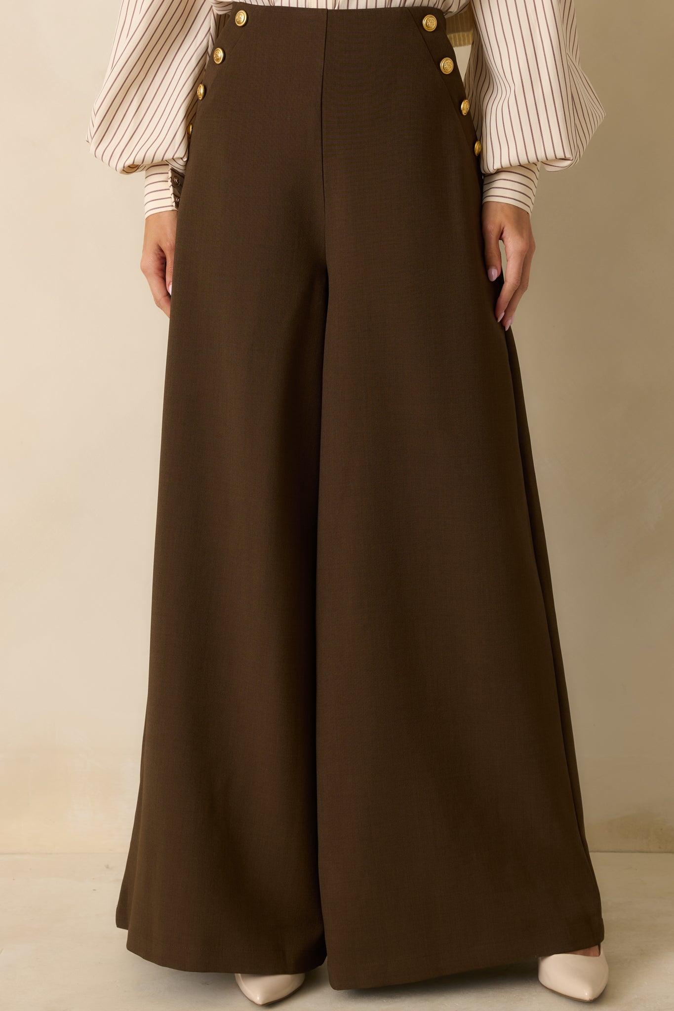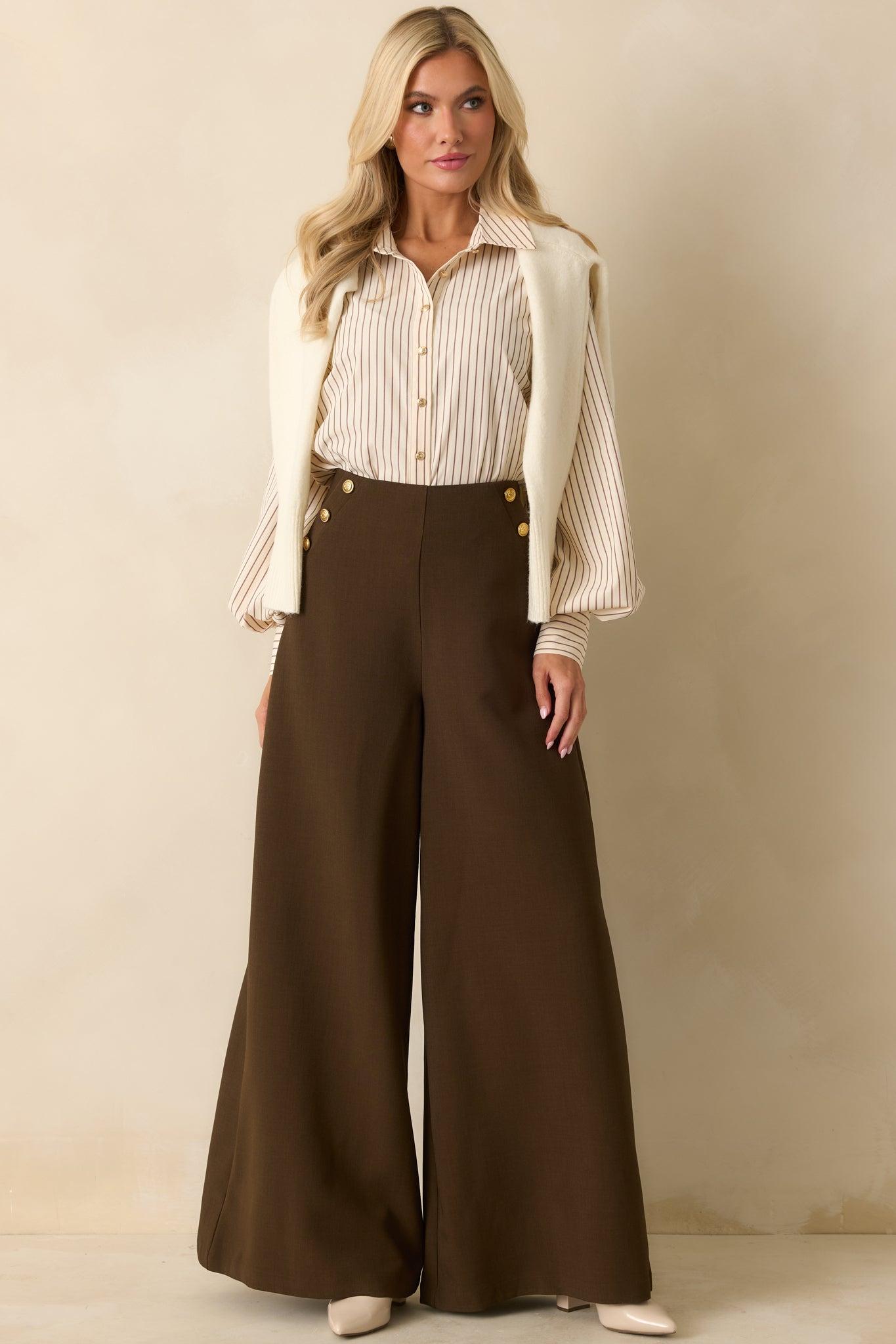 Chart your own path in the Chart the Course Dark Brown Wide Leg Button Pants, a polished twist on a classic sailor silhouette. The structured drape and gold embossed buttons bring all the refined confidence, while the deep chocolate brown keeps them grounded and totally wearable for work, weekends, and every stylish stop along the way. These dark brown wide-leg pants feature a high-rise waist, embossed gold button accents along each hip, and a tailored wide-leg silhouette with a concealed back zipper closure; crafted from a smooth woven fabric with minimal stretch. 95% Polyester & 4% Spandex Unlined Hand Wash Cold Manufactured in China Designed in The USA Model is 5'8" and Wearing a Size Small, Clipped, Model is a True X-Small