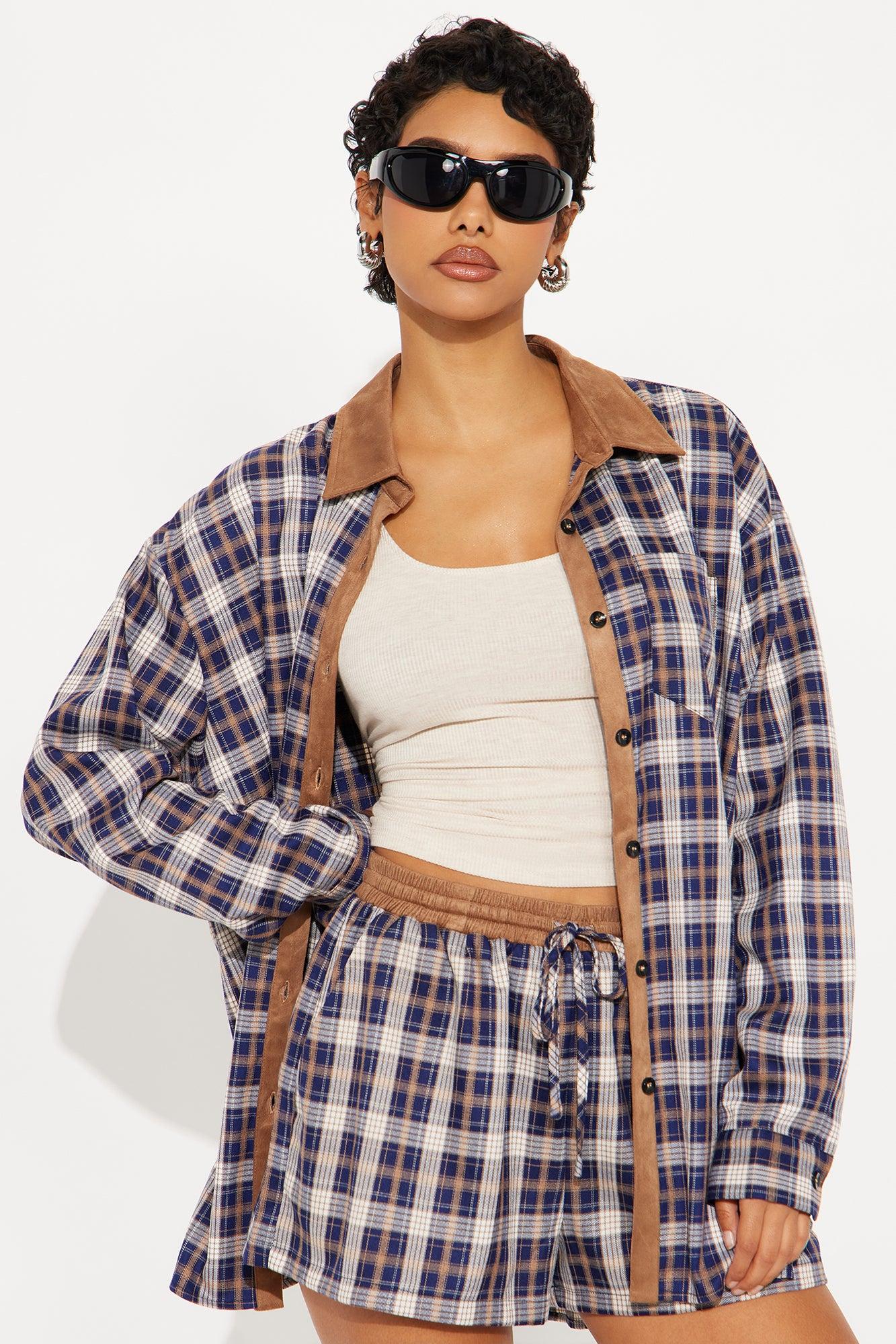 Available In Blue/combo. 2 Piece Ensemble Button Up Shirt And Short Set Non Stretch Elastic Waist With Drawstring On Short Pockets Self: 80%Polyester 15%Rayon 5%Spandex Contrast: 90%Polyester 10%Spandex Imported California Proposition 65WARNING: Cancer and Reproductive Harm - www.P65Warnings.ca.gov.
