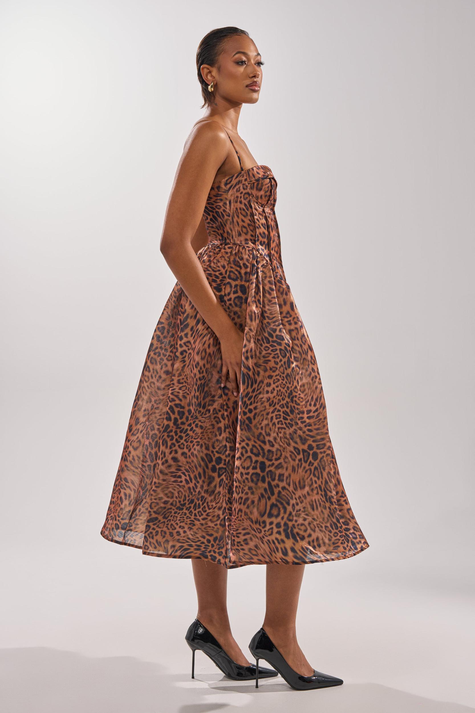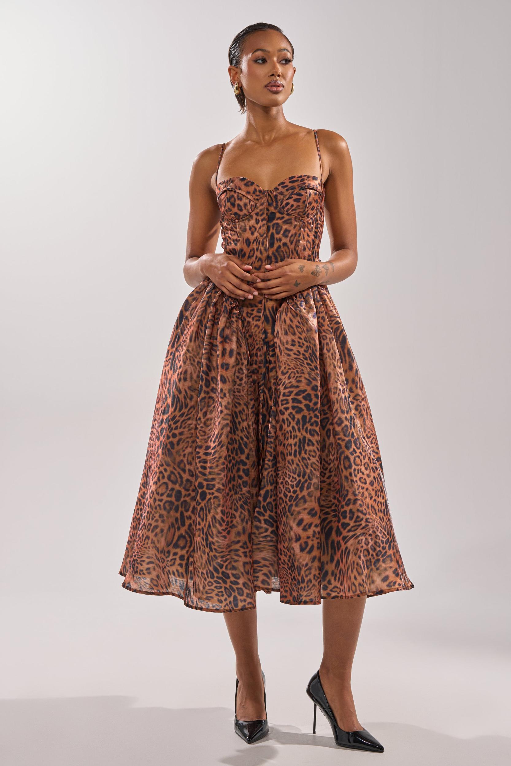 Look as fierce as ever in The AKIRA Label Cheetah Sisters Midi Dress. Crafted from a sleek, subtly shimmery fabric adorned with a classic leopard print pattern, this dress features a fit ‘n flare silhouette, a corseted bodice with structural boning, a sweetheart neckline with lightly padded bust cups, and thin, adjustable shoulder straps. The flouncy skirt hits around the calves and boasts pleated detailing and tulle lining for volume and structure. Complete with sleek interior lining and a tonal back zipper closure. - Main: 100% Polyester, Lining: 95% Polyester, 5% Spandex- No Stretch- Imported (all measurements approximate from size small)- 43” Chest to Hem- 16” Shoulder Straps (Adjustable)- Model is 5’9” and wearing a size smallProduct ID: 1031776