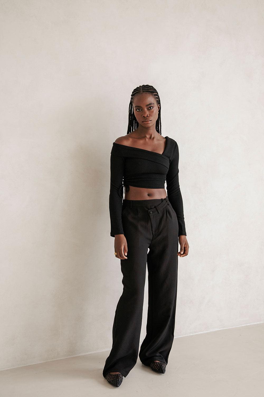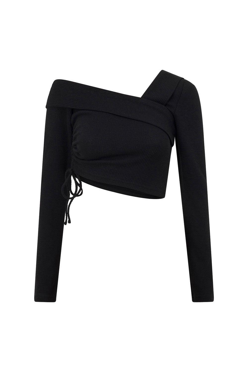 The perfect versatile styling piece! The Chelsea Top is made from a soft ribbed knit fabric in black. It features an asymmetric neckline with one off-shoulder, folded panel across neckline and sleeve, full length fitted sleeves and an adjustable draw detail at side waist. Pair with jeans or dress it up with the Rocio Wrap Skort! Designed exclusively by Sabo.