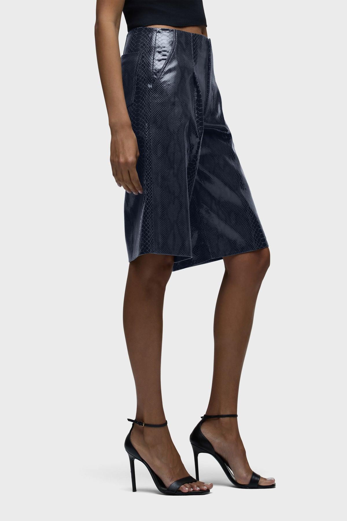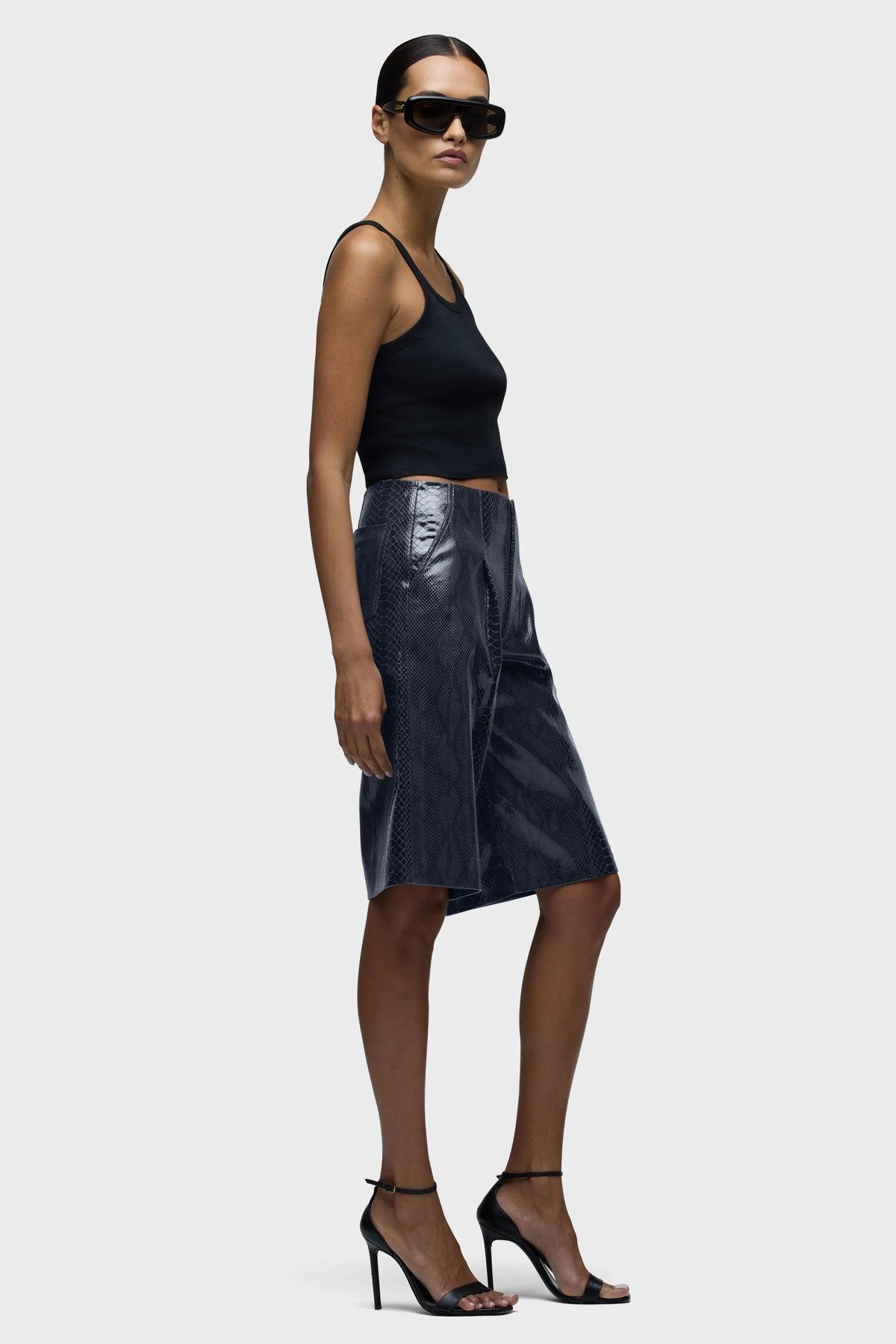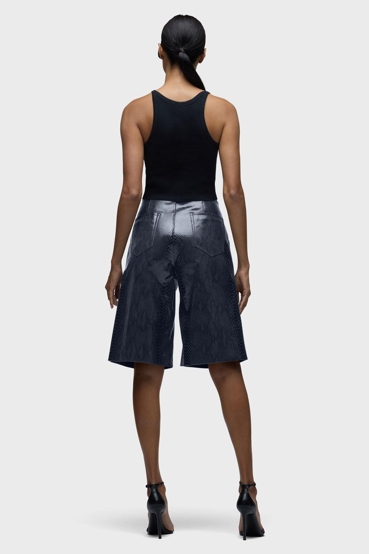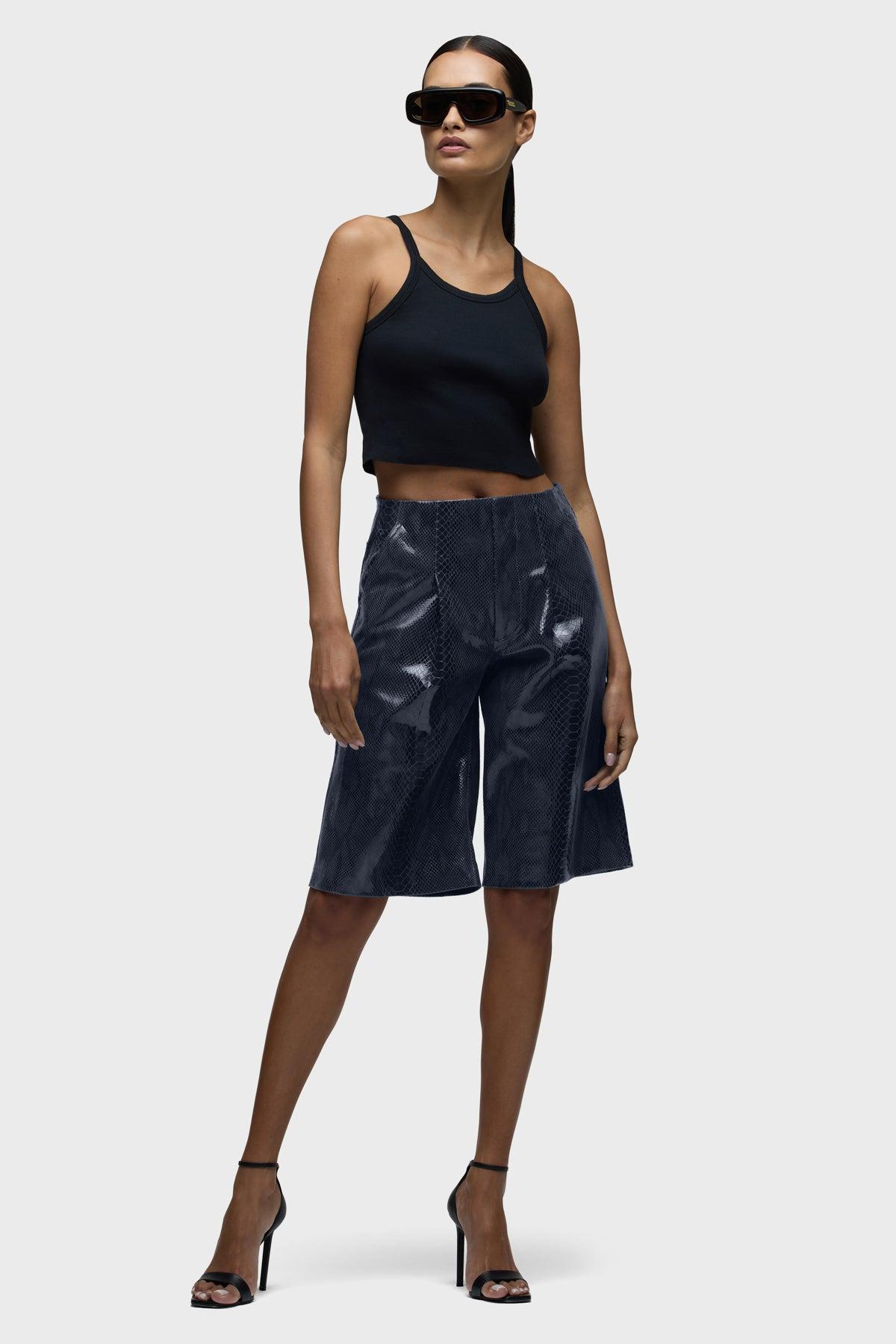 Description Part of our Brooks Nader collab capsule, the Cherie Cobra Short in Tiger Bite is a deep blue snakeskin short made of genuine leather. It is finished with a pleated front, front zipper and hook-and-bar closure. This capsule was curated by model Brooks Nader and features her personal closet must-haves. Product Details Front Rise: 12", Leg Opening: 25", Inseam: 13"Model Height 5'9"Model wearing size 25Measurements based on size 27 Fit & Care Content: 100% Goat LeatherCare of Leather Specialist Only