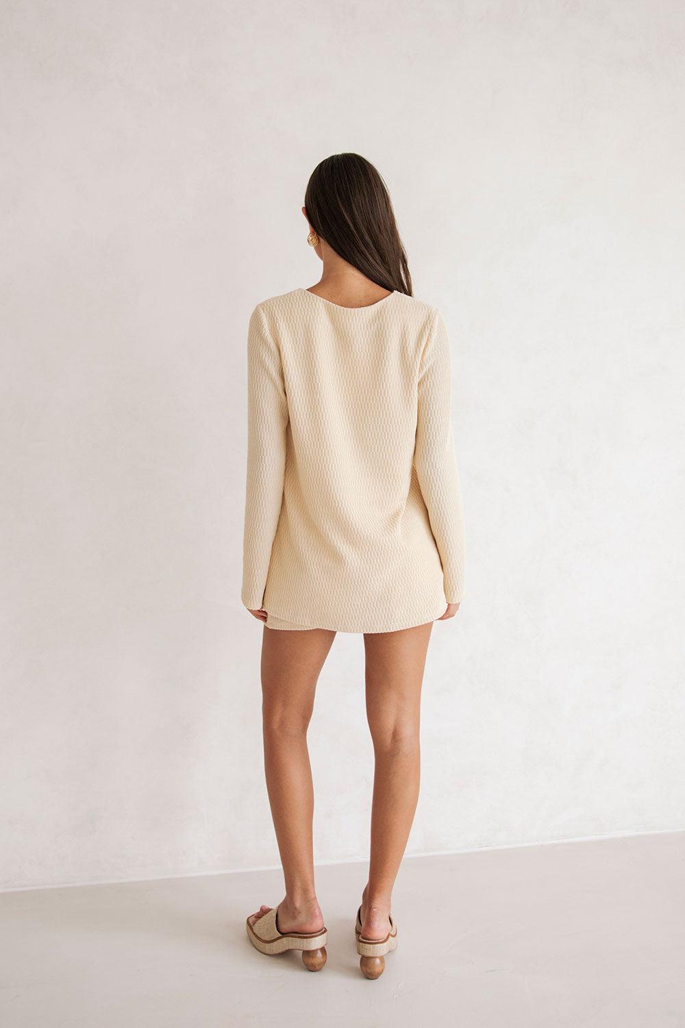 A must-have super versatile styling piece! The Chester Top is made from a soft textured fabric in a cream hue featuring relaxed full length sleeves and a plunging V neckline with tie closure at centre bust. Get the set and pair with the Chester Skirt or style with jeans! Designed exclusively by Sabo.