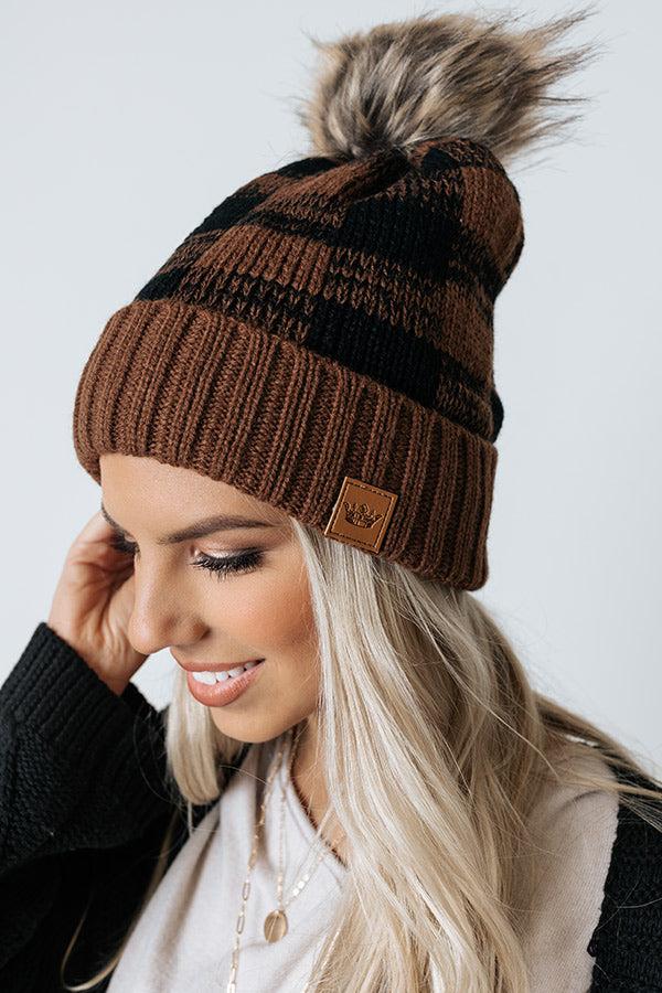 Take on those chilly winter days effortlessly and stylishly with this adorable chocolate colored beanie featuring stretchy knit material with soft fleece lining, a black buffalo check print a rolled hemline, and a faux fur accent pom pom!