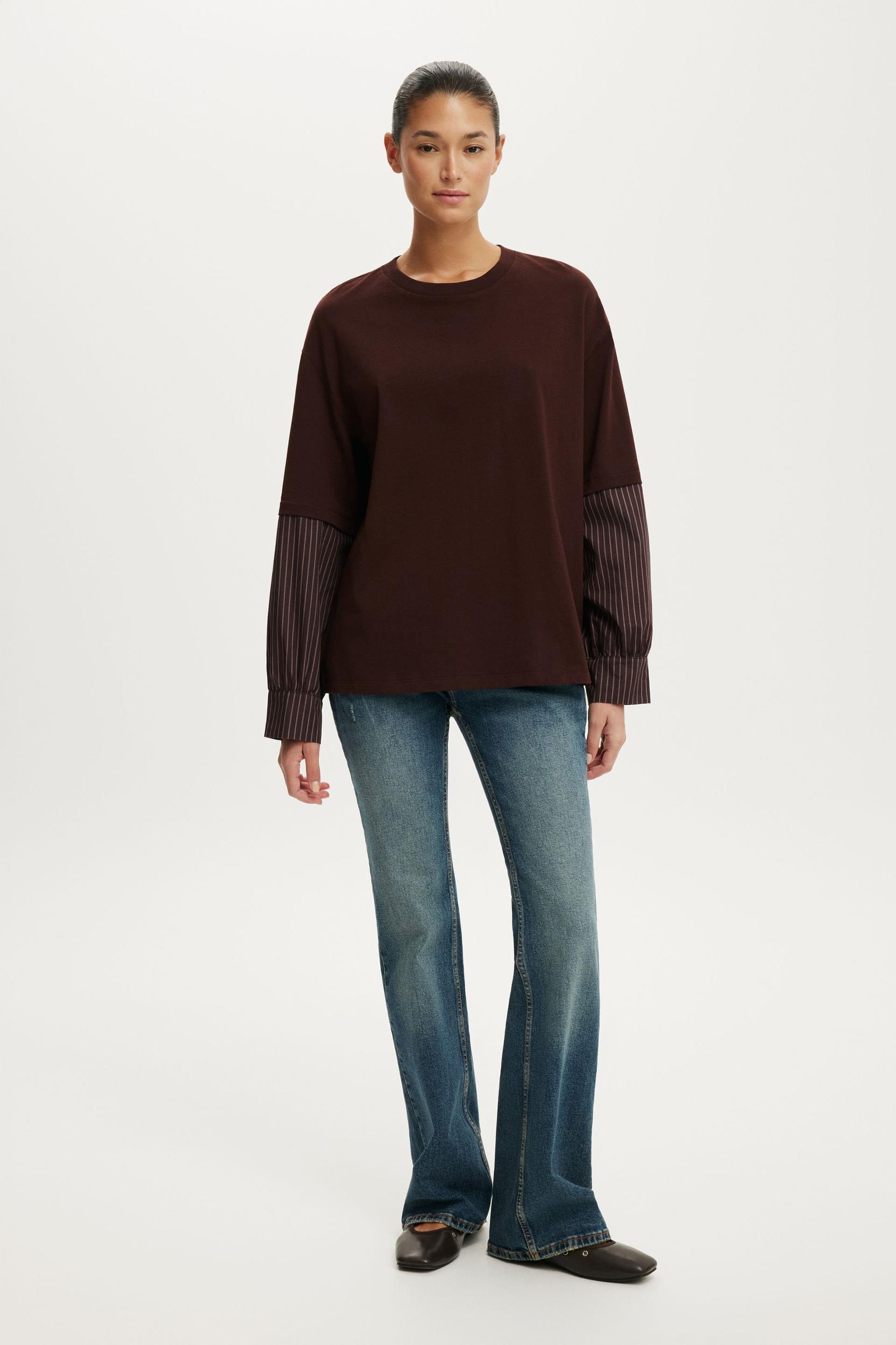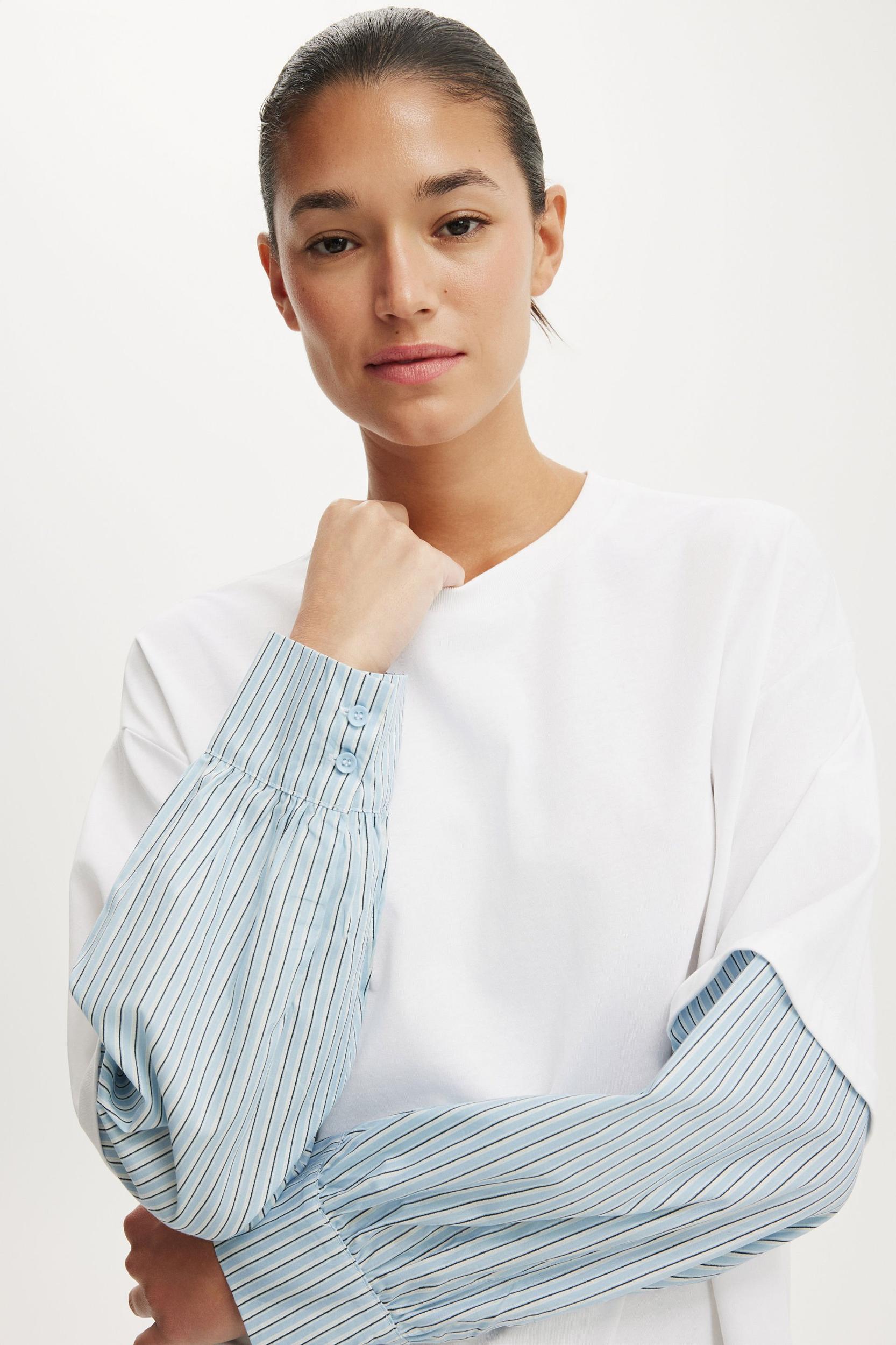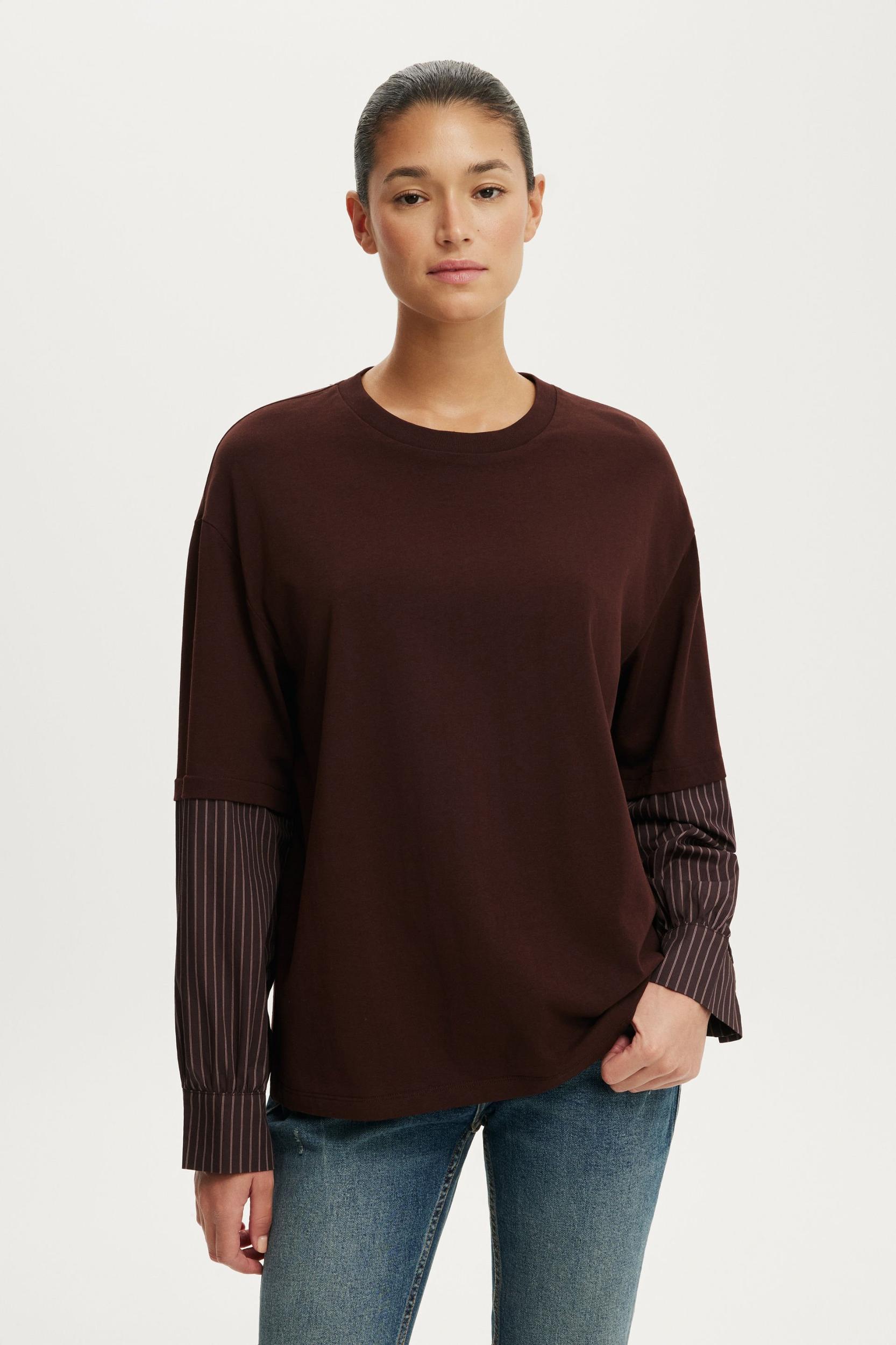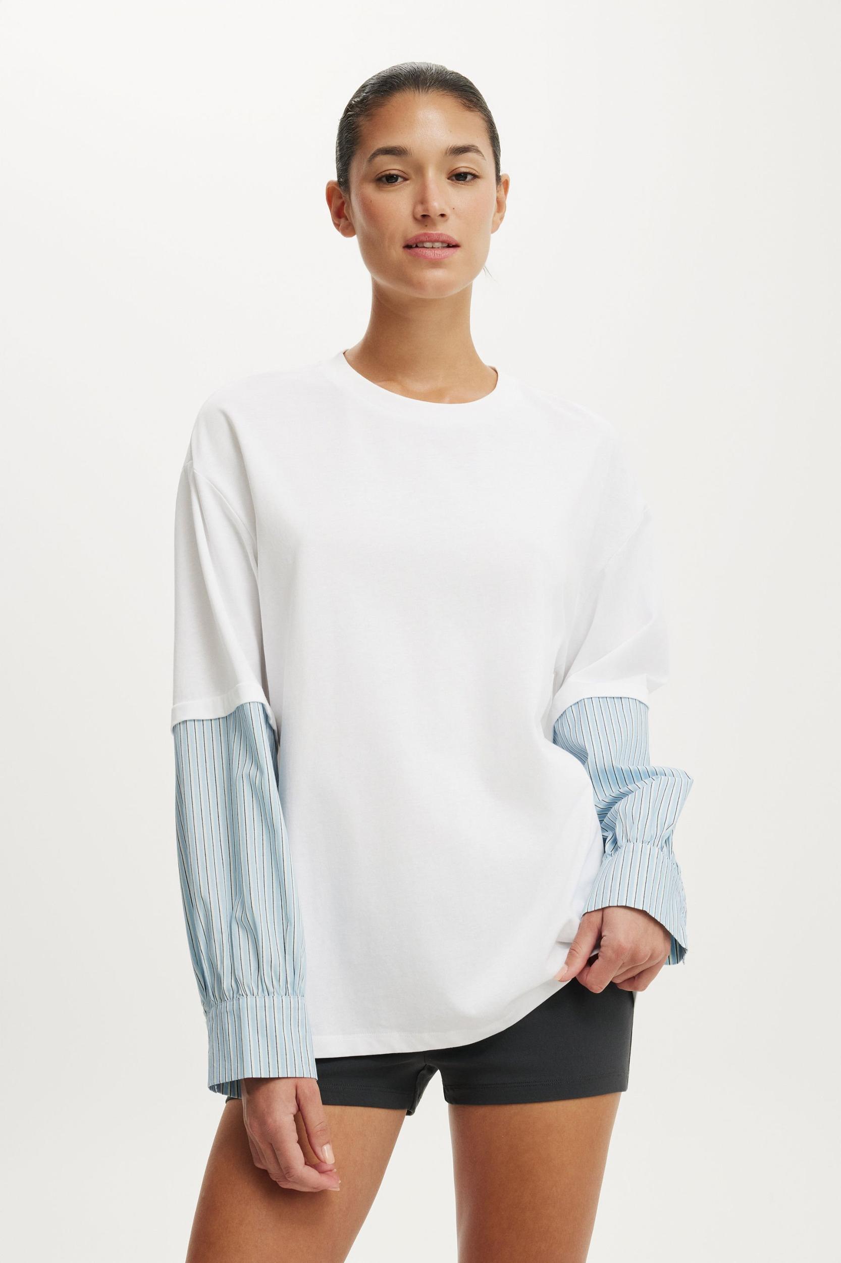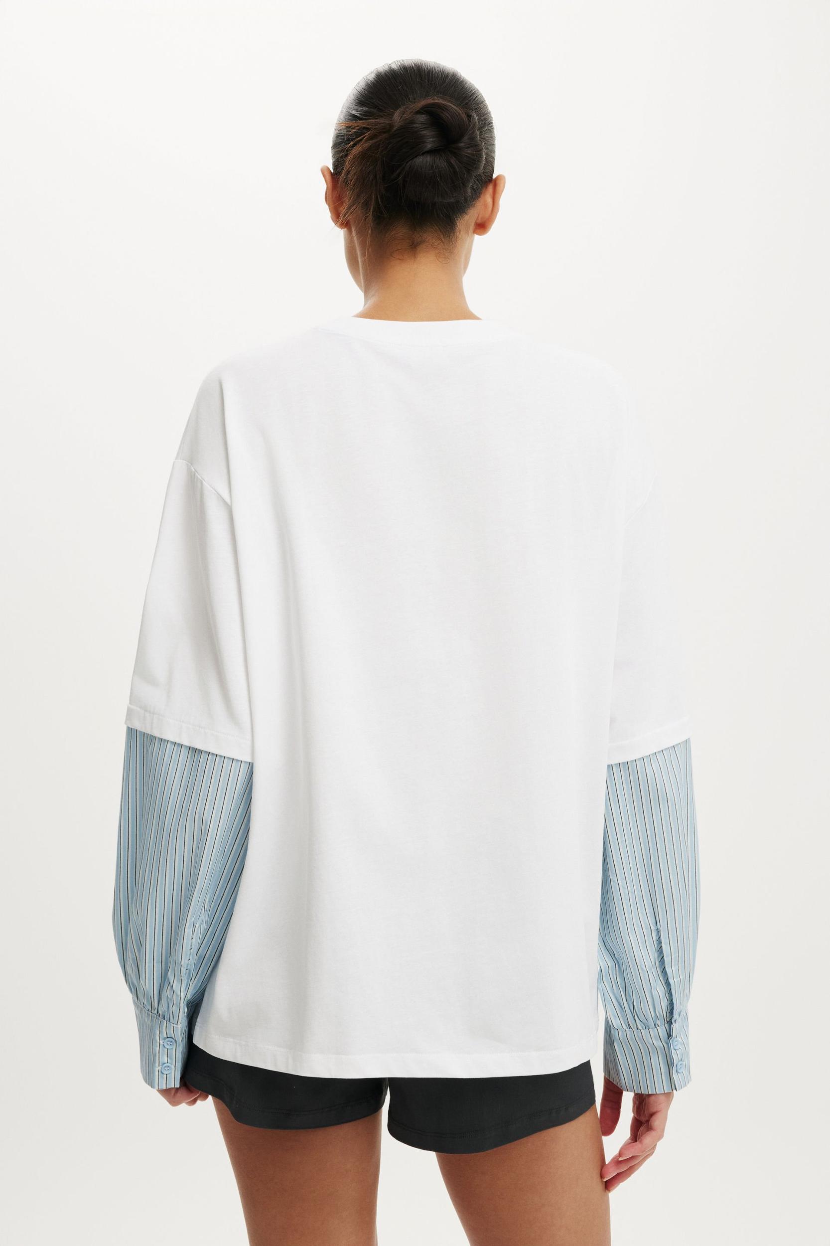 LONG SLEEVE LAYERED SHIRT ,CUT AND SEW T SHIRT BODY FABRICATION ,WOVEN SLEEVE ,FUNCTIONAL BUTTON AND PLACKET AT SLEEVE OPENING