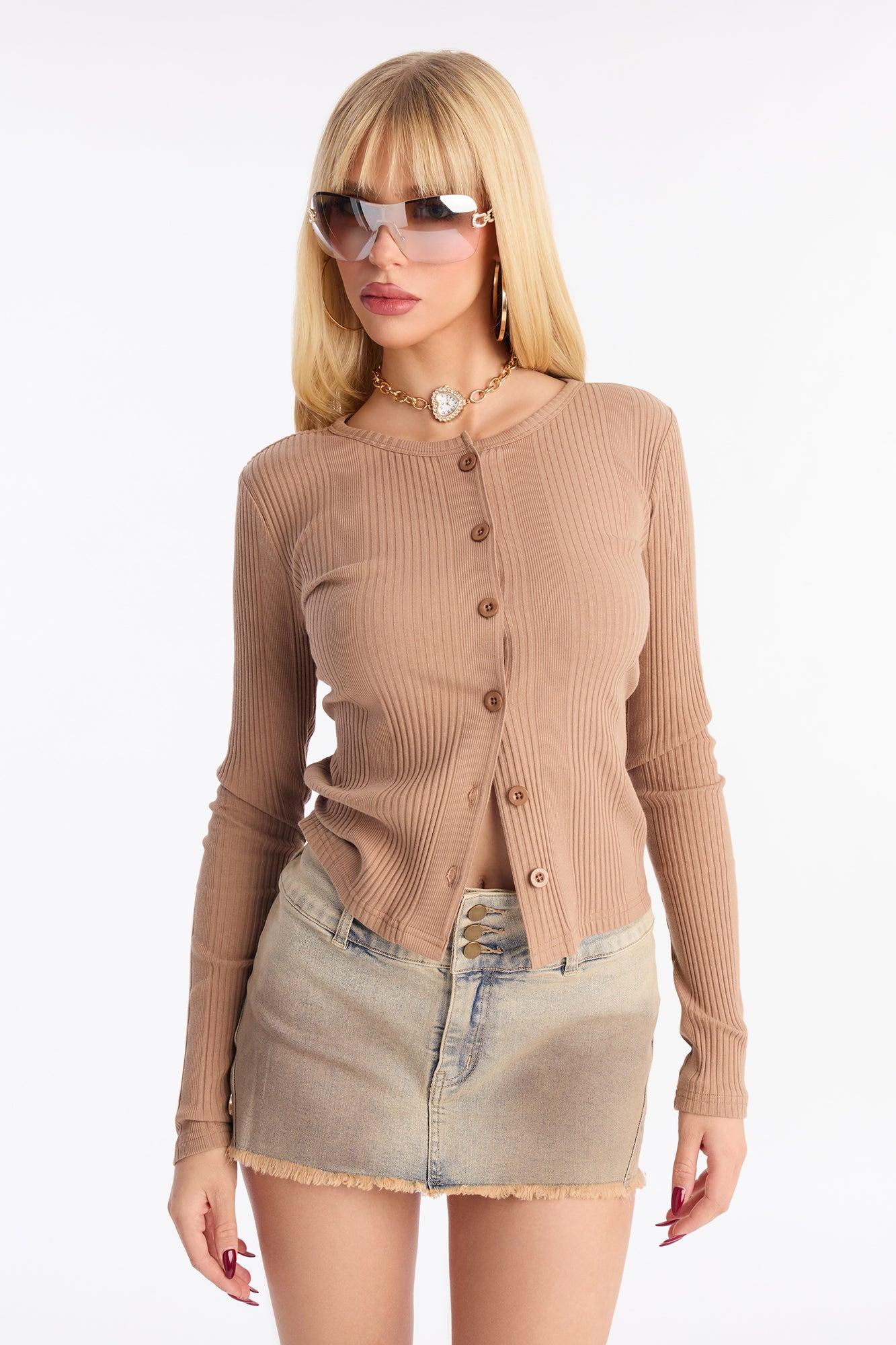 Chloe Ribbed Button Up Top - Taupe Female