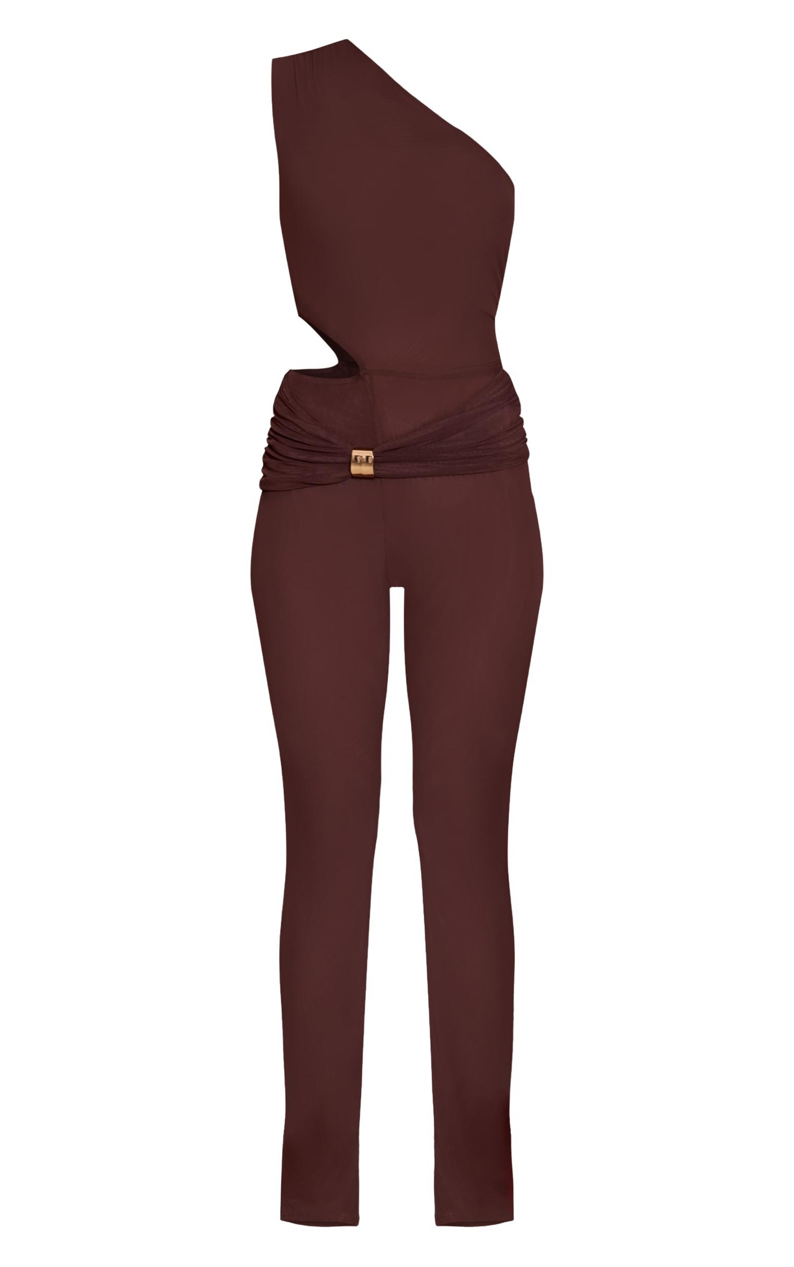 Acknowledge your confident style in the chocolate double mesh trim detail flared jumpsuit. It features a one-shoulder neckline, a gold-tone buckled waist cut-out, and flared legs. Perfect for unforgettable evening plans, this piece promises impact. Elevate the look with clear heels and subtle gold stud earrings.Length approx 155cm/61inch (Based on sample size US 4)Model wears size UK 8/ EU 36/ AUS 8/ US 4Model Height - 5ft 8inchp]:!mb-4inch>Brand: PrettyLittleThingCategory: DressesProduct type: Flared JumpsuitColor: ChocolateMaterial: Slinky JerseyOccasion: Evening