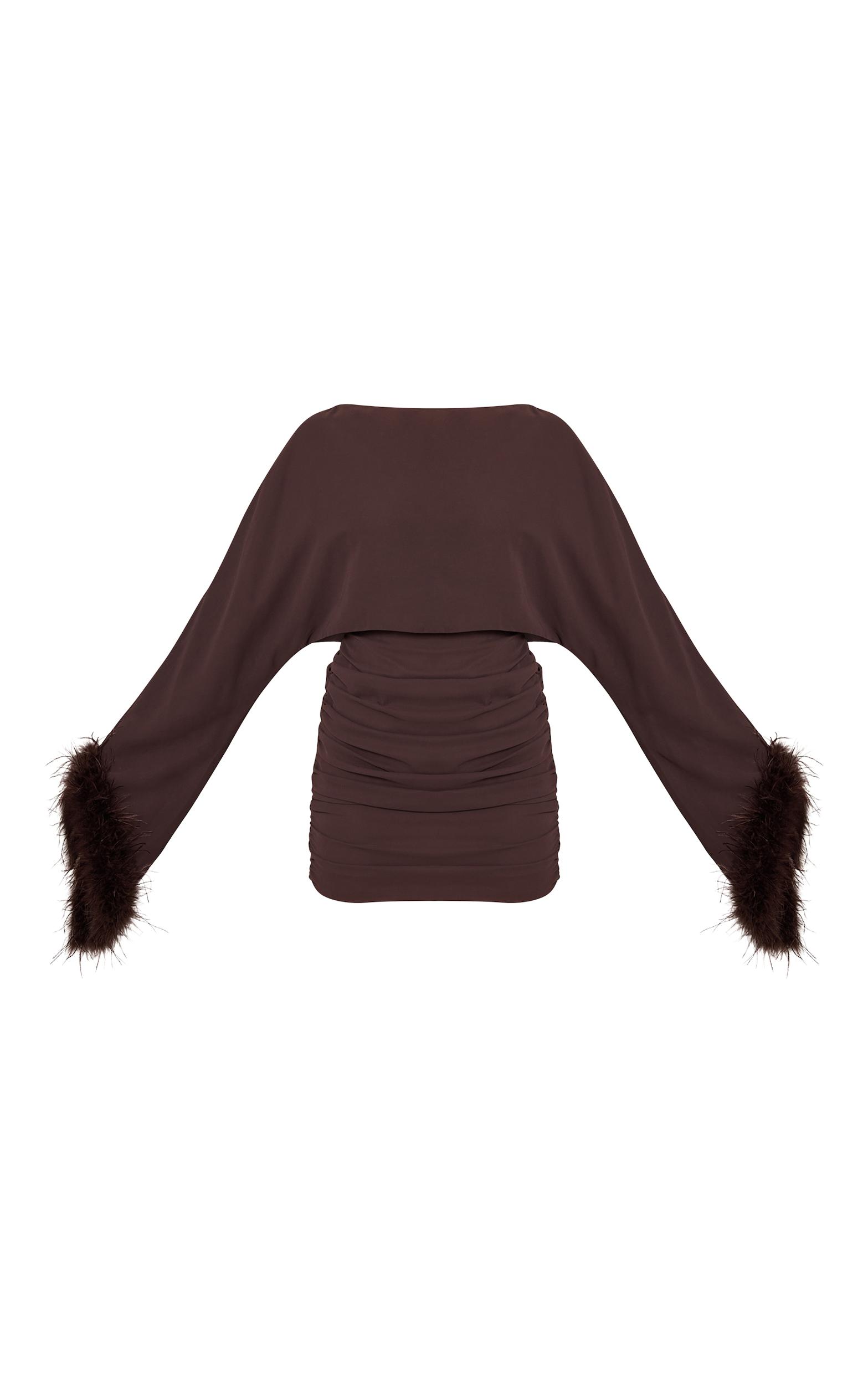 The chocolate extreme feather cuff ruched bodycon dress is here. With a boat neck, ruched body, and feather cuffs. Perfect for special occasions. Style with chunky heels and drop earrings.Length approx 81.5cm/32inch (Based on sample size US 4)Model wears size UK 8/ EU 36/ AUS 8/ US 4Model Height - 5ft 8inchp]:!mb-4inch>Brand: PrettyLittleThingCategory: DressesProduct type: Bodycon DressColor: ChocolateMaterial: ChiffonOccasion: Occasion