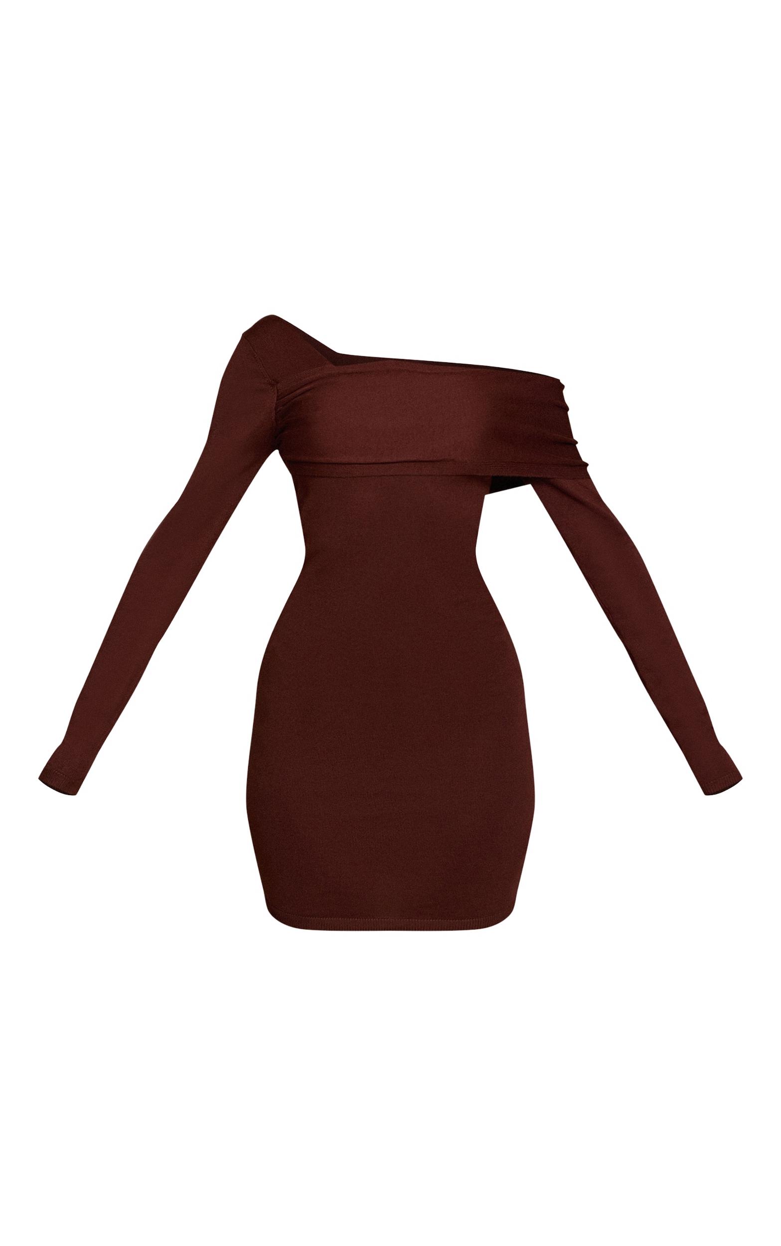 Embrace confident style with the chocolate long sleeve asymmetric knitted mini dress. Crafted in a rich chocolate knit, it features an asymmetric neckline, long sleeves, and a sleek mini cut. Perfect for those refined evening plans or confident after-dark moments. Team with statement heels and minimalist accessories for a polished finish.Length approx 81.5cm/32inch (Based on sample size S)Model wears size SModel Height - 5ft 6inchp]:!mb-4inch>Category: KnitwearProduct type: Bodycon DressColor: ChocolateMaterial: KnitOccasion: Evening