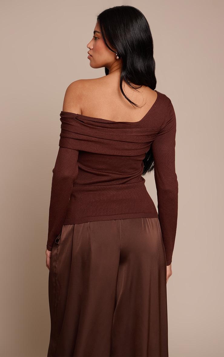 Own the night in this chocolate long sleeve asymmetric shoulder knitted top. Its knitted chocolate design boasts a singular long sleeve and striking asymmetric neckline. The ultimate pick for an unforgettable evening out. Style with wide-leg pants, sleek black kitten heels, and delicate gold earrings.Length approx 48.5cm/19inch (Based on sample size S)Model wears size SModel Height - 5ft 6inchp]:!mb-4inch>Category: KnitwearProduct type: Bardot TopColor: ChocolateMaterial: KnitOccasion: Evening