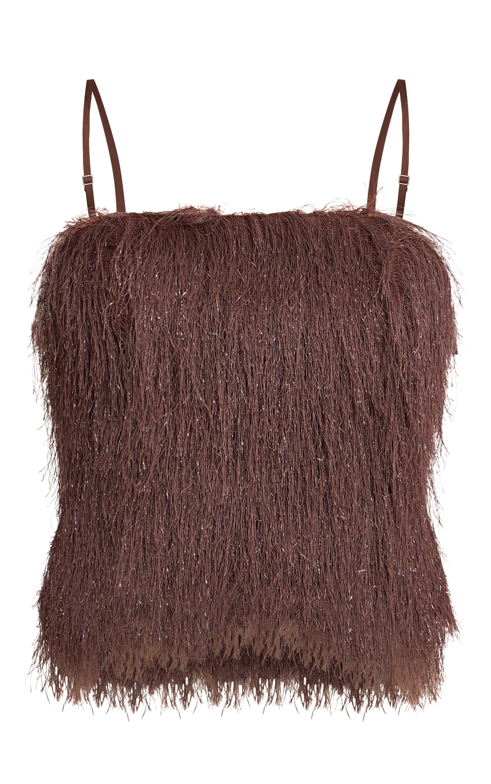 Channel confident energy with the chocolate metallic fringe cami top. It's designed with sleek spaghetti straps and a shimmering fringe overlay. Perfect for those confident after-dark plans in your diary, ensuring you make an entrance. Complete the look with tailored wide-leg pants, chic brown heels, and subtle gold earrings for a polished aesthetic.Length approx 48.5cm/19inch (Based on sample size US 4)Model wears size UK 8/ EU 36/ AUS 8/ US 4Model Height - 5ft 7inchp]:!mb-4inch>Brand: PrettyLittleThingCategory: TopsProduct type: Cami TopColor: ChocolateMaterial: SatinOccasion: Evening