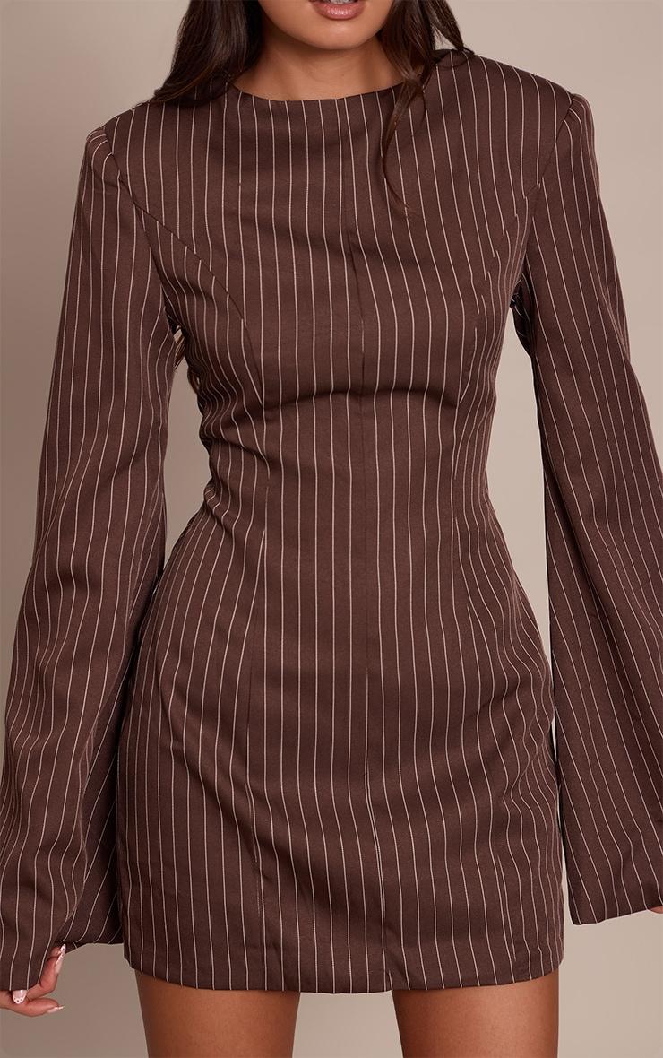 Own the day in the chocolate pinstripe boat neck structured long sleeve mini dress. In chocolate pinstripe, it features a boat neckline, structured shoulders, and a mini cut. An essential for refined day plans or smart meet-ups. Complete the look with sharp brown heels and gold stud earrings.Length approx 81.5cm/32inch (Based on sample size US 4)Model wears size UK 8/ EU 36/ AUS 8/ US 4Model Height - 5ft 7inchp]:!mb-4inch>Brand: PrettyLittleThingCategory: DressesProduct type: Bodycon DressColor: ChocolateMaterial: Woven CrepeSleeves: LongOccasion: Day