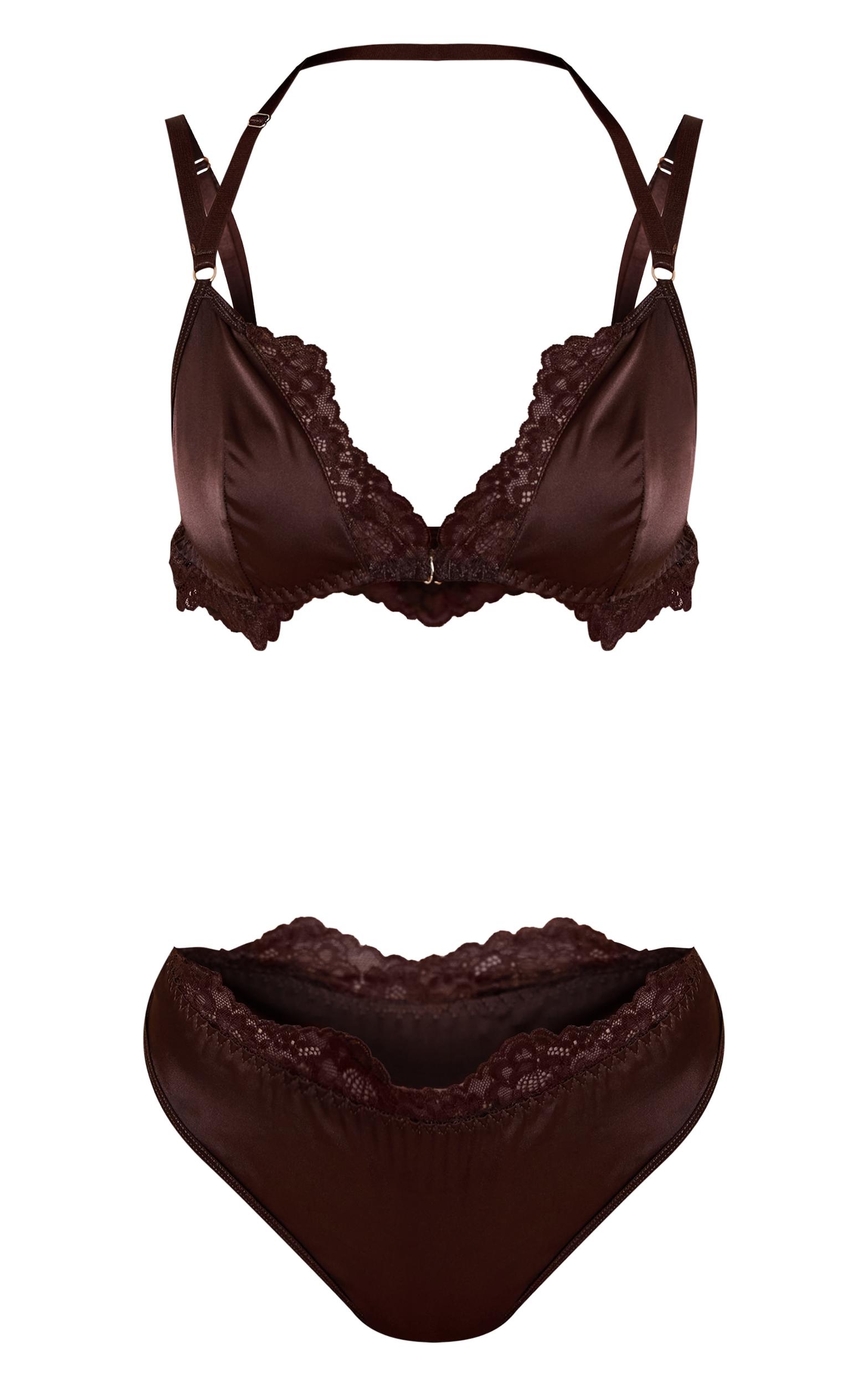 Master foundational layering with artful intention. The chocolate satin lace detail bra & panties set presents a refined V-neck triangle bra, intricately trimmed with delicate lace and featuring slender, adjustable straps that meet a confident front fastening. Its matching high-cut panties echo the lace detailing, crafting a cohesive, understated presence. For a knowing daytime aesthetic, layer this rich chocolate set under an open, oversized white shirt and sharp tailored pants, allowing subtle hints of lace to emerge. Ground the ensemble with discerning knee high boots and complete your self-assured look with a structured black bag, affirming an effortlessly polished appeal. Top length approx 29cm/11.5inch Bottoms length approx 28cm/11inch (Based on sample size S)Model wears size SModel Height - 5ft 6inchp]:!mb-4inch>Brand: PrettyLittleThingCategory: Lingerie & NightwearProduct type: 2 PieceColor: ChocolateMaterial: MeshOccasion: Day