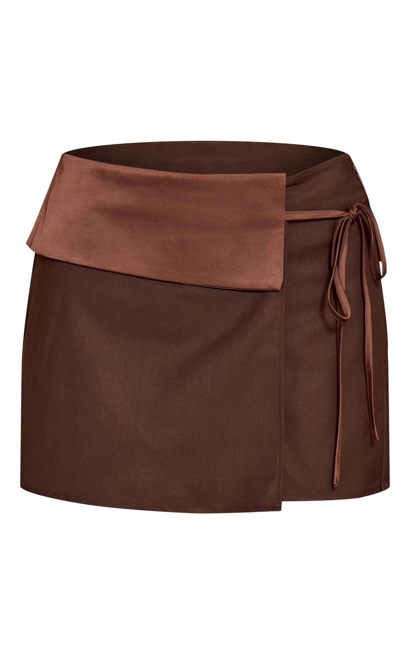 Command your evening presence with an assured, contemporary cut. The chocolate satin waistband wrap skort defines a sharp mini silhouette, cleverly integrated with shorts for undeniable confidence and movement. Its distinctive wrap front, detailed with subtle ties at the waist, creates a compelling asymmetrical line. A sleek chocolate satin waistband provides a refined finish to this modern take on evening bottoms. Style this essential piece with a streamlined camisole or a sharp tailored blazer for a polished look, completed with subtle heeled mules for an effortlessly sophisticated after-dark impact.Length approx 33cm/13inch (Based on sample size US 4)Model wears size UK 8/ EU 36/ AUS 8/ US 4Model Height - 5ft 7inchp]:!mb-4inch>Brand: PrettyLittleThingCategory: BottomsProduct type: SkortColor: ChocolateMaterial: Tailored WovenDesign: PlainOccasion: Evening