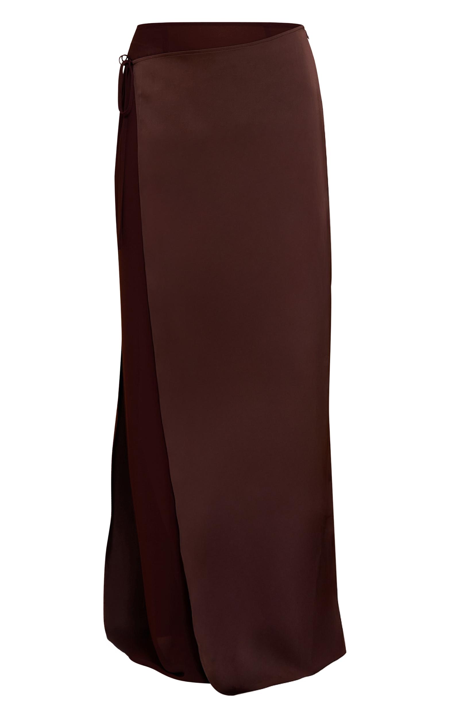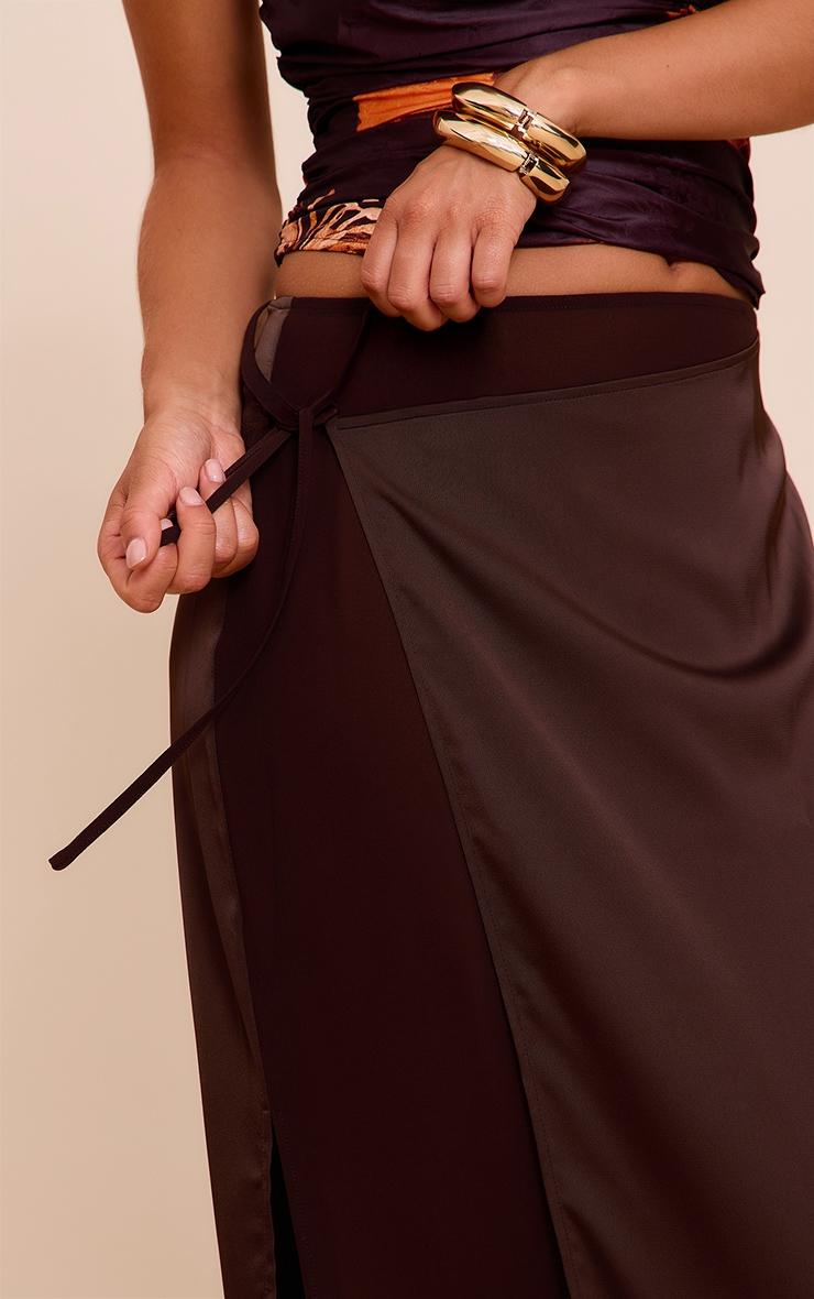 Exude sophistication in this chocolate satin wrap detail chiffon maxi skirt. Made from a chocolate hue material, this skirt has a wrap detail design, chiffon panel and a maxi length fit. Add a complementing bandeau top, chunky bangles and sleek heels for a perfected look.Length approx 108cm/42.5inch (Based on sample size US 4)Model wears size UK 8/ EU 36/ AUS 8/ US 4Model Height - 5ft 7inchp]:!mb-4inch>Category: BottomsProduct type: Maxi SkirtColor: ChocolateMaterial: SatinDesign: PlainOccasion: Day