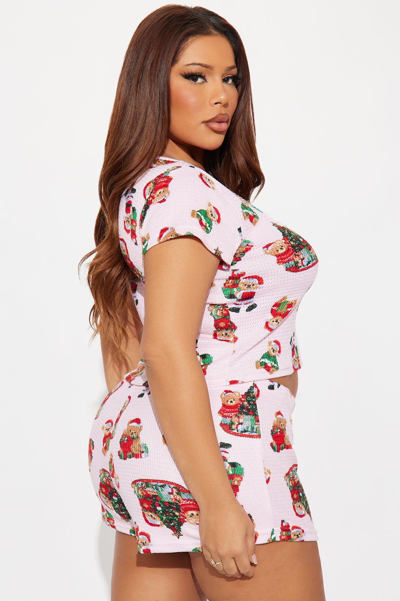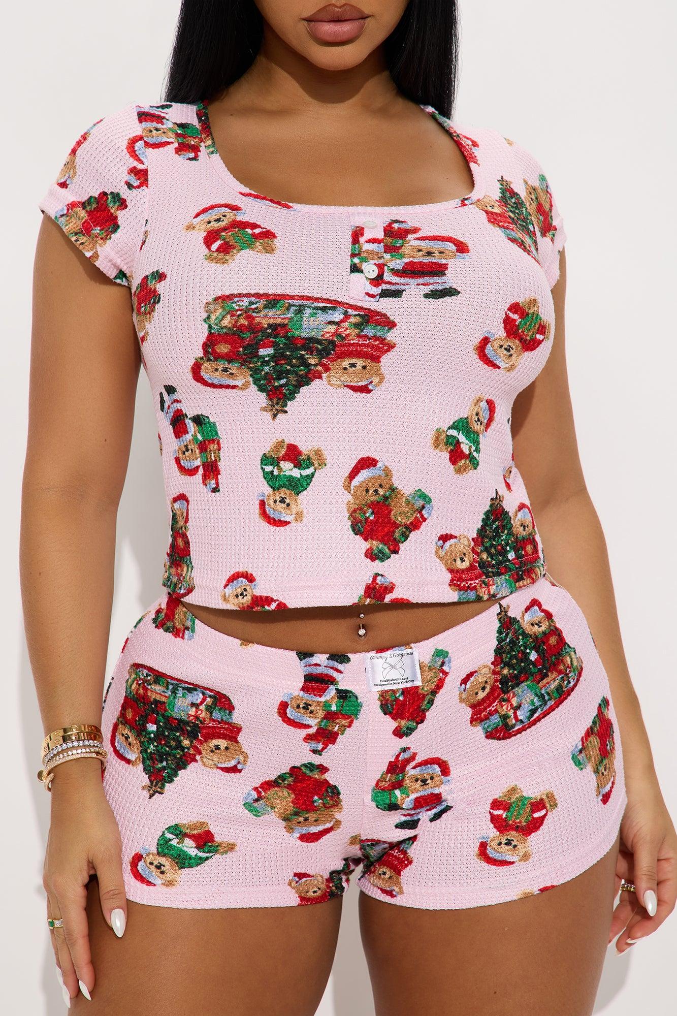 Christmas Teddy Bears Waffle Short Sleeve PJ Boxer Short Set - Pink Female