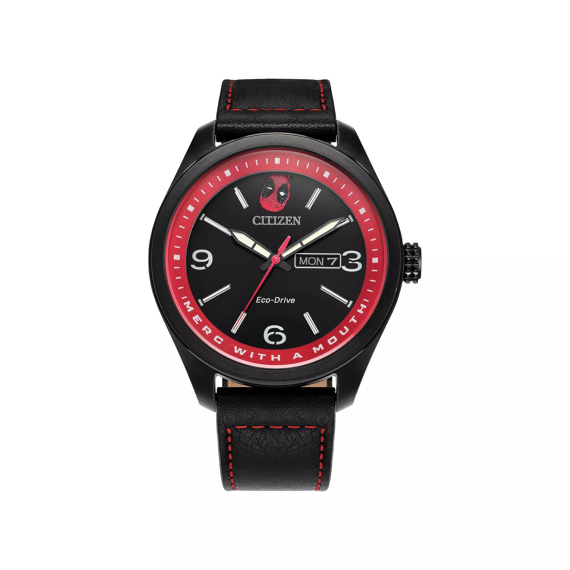 From Citizen, this mens watch features:Black ion plated stainless steel caseApprox. 42mm caseCase back is engraved with the characterBlack textured dial, features Deadpool at 12 o clockIlluminated hands and markersRed dial ring sports the characters nickname, Merc With a MouthBlack leather strap with red top stitchingEco-Drive technologyMultifunction movementBuckle closureImported.
