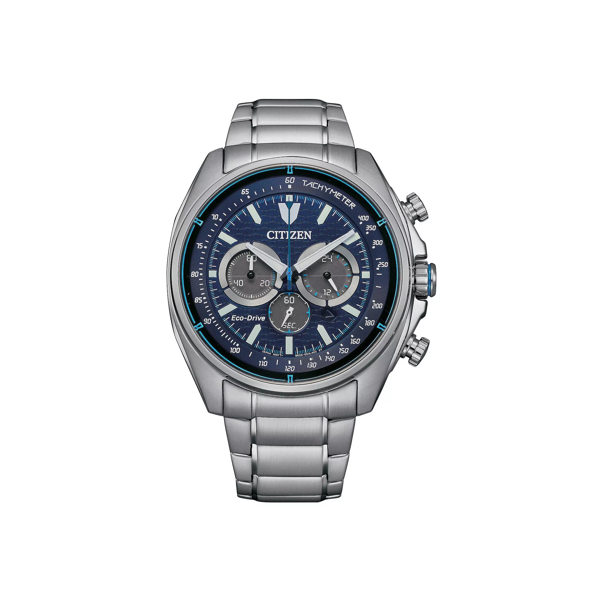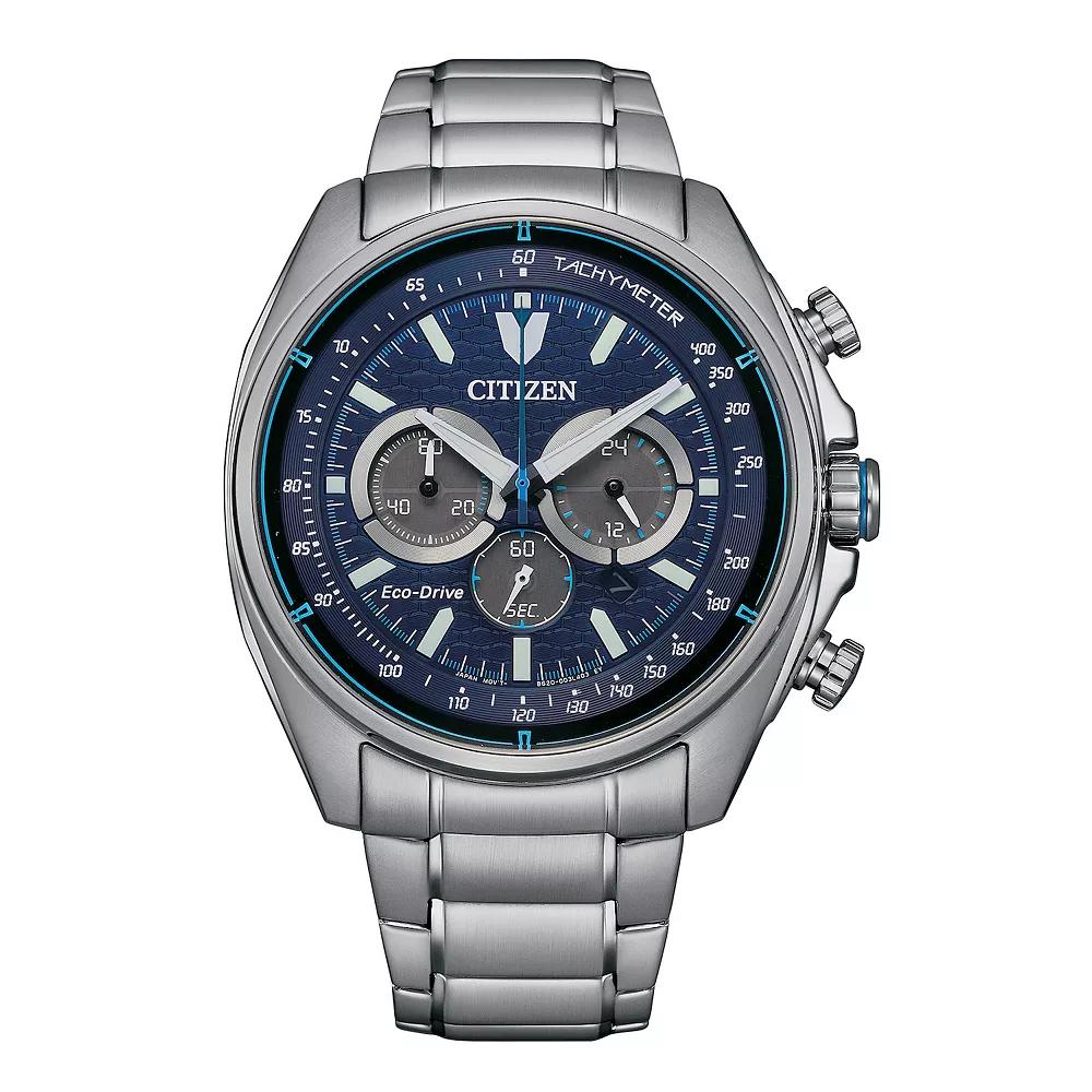 Silver-tone stainless steel case and bracelet. Fixed silver-tone stainless steel bezel. Blue dial with white hands and index hour markers. Minute markers around the inner rim. Tachymeter around the outer rim. Dial Type: Analog. Chronograph - three sub-dials displaying: 60 second, 60 minute and 24 hour. Citizen Caliber Eco-Drive B620 eco-drive movement. Scratch resistant mineral crystal. Pull / push crown. Solid case back. Round case shape, case size: 44 mm, case thickness: 12 mm. Deployment with push button release clasp. Water resistant at 100 meters / 330 feet. Functions: chronograph, date, hour, minute, second, solar-powered. Sport watch style. Watch label: Japan Movt. Citizen Chronograph Blue Dial Mens Watch CA4560-81L.