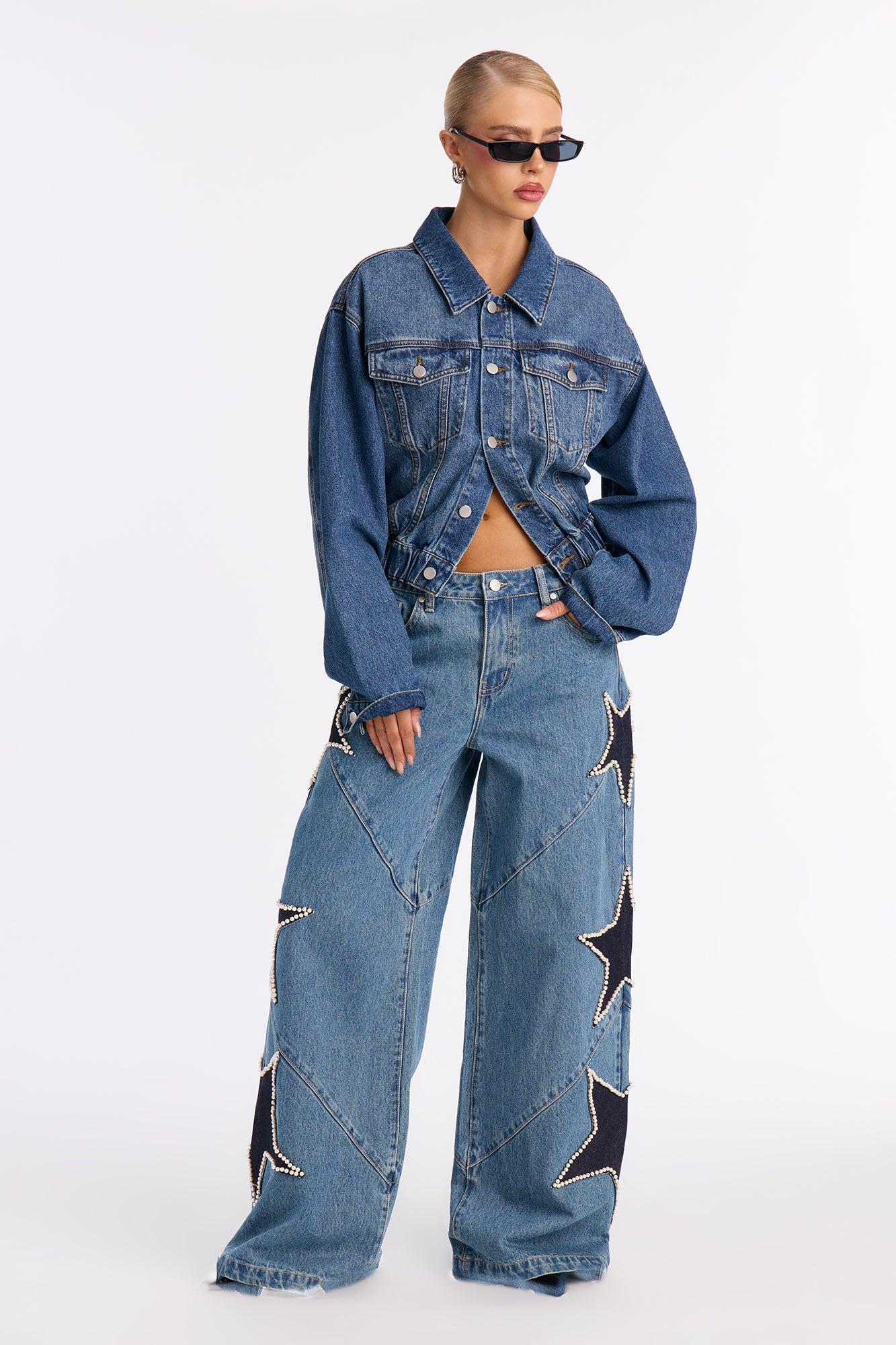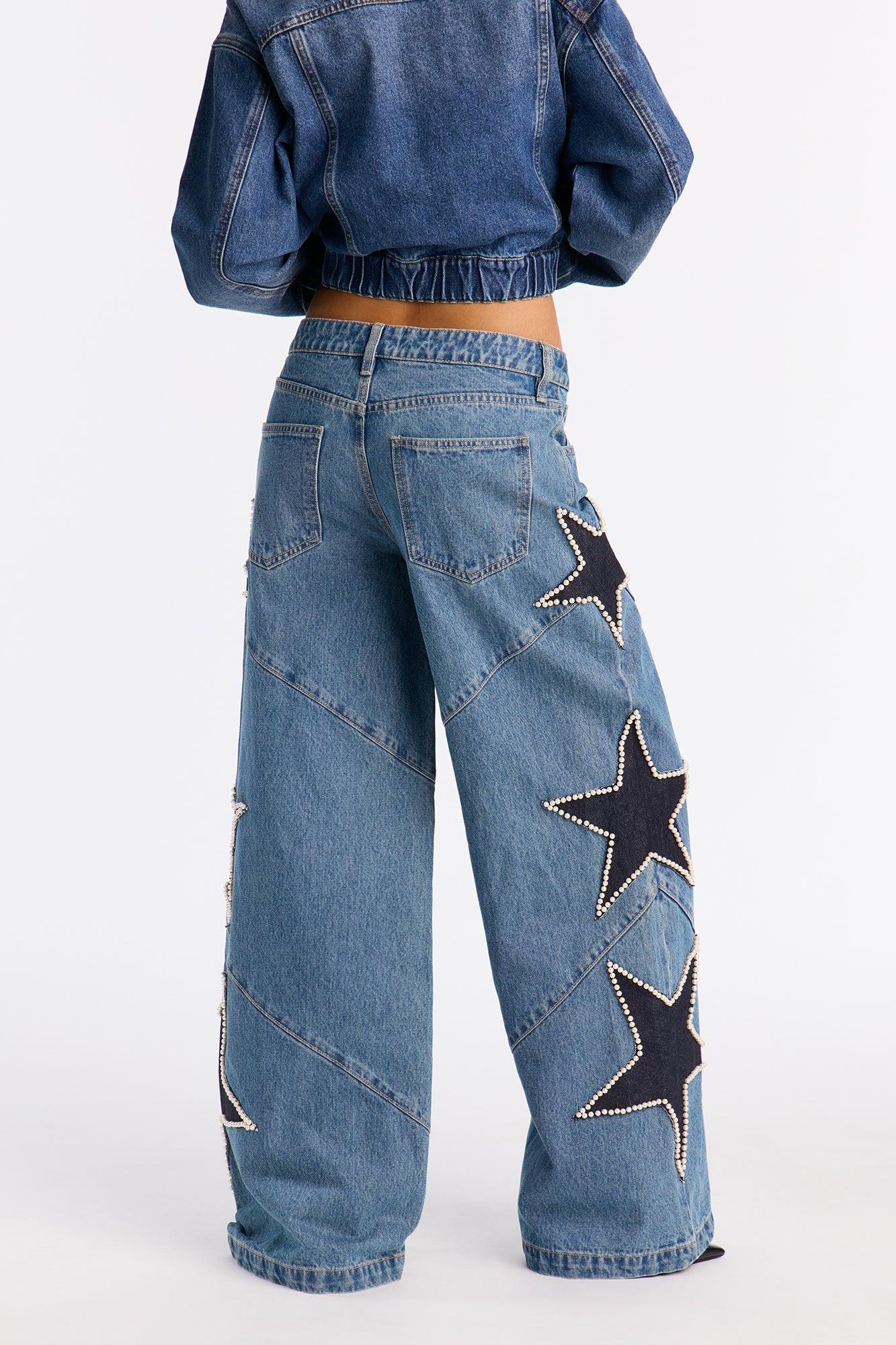 Available In Vintage Wash. Wide Leg Jean 5 Pocket Star Patch Detail Embellished Stars 10.5" Rise 32" Inseam Non-Stretch Disclaimer: Due To The Specialized Wash, Each Garment Is Unique. 100% Cotton Imported California Proposition 65WARNING: Cancer and Reproductive Harm - www.P65Warnings.ca.gov.