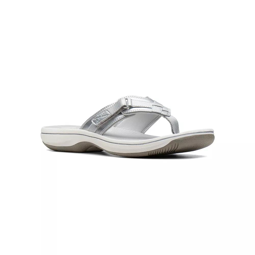 These Clarks Breeze Sea Cloudstepper sandals are incredibly light, effortlessly flexible, and supremely soft. They're so light that you can toss them into your carry-on or beach bag without noticing their weight. Click this FOOTWEAR GUIDE to find the perfect fit and more! - https://www.kohls.com/feature/shoesizeguide.jsp. SHOE FEATURES: Subtle closure on its strap makes for a secure, adjustable fit while providing extra visual interest, EVA midsole and a soft EVA footbed allow this classic flip-flop to be incredibly lightweight and comfortably supportive. SHOE CONSTRUCTION: Textile, fabric lining, EVA midsole, TPR outsole, Synthetic upper. SHOE DETAILS: Slip-on, EVA footbed, 1.18-in. heel, Open toe. Size: 8. Color: Silver Metallic. Gender: female. Age Group: adult.