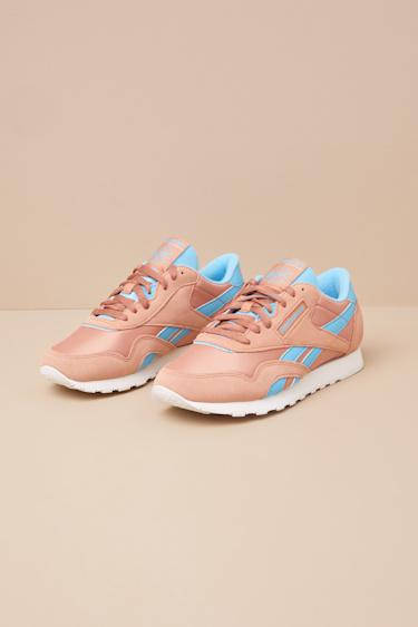 Lace up the Reebok Classic Nylon Clay and Blue Suede Leather Sneakers and face the day with confidence! Genuine suede leather and sleek nylon come together to shape these retro-cute sneakers with a classic rounded toe, a lace-up vamp, and a terry-lined, low-cut collar. An iconic striped design accents the instep and outstep, while an adventure-ready sole completes the look. Logo tags at the tongue, outstep, and heel.