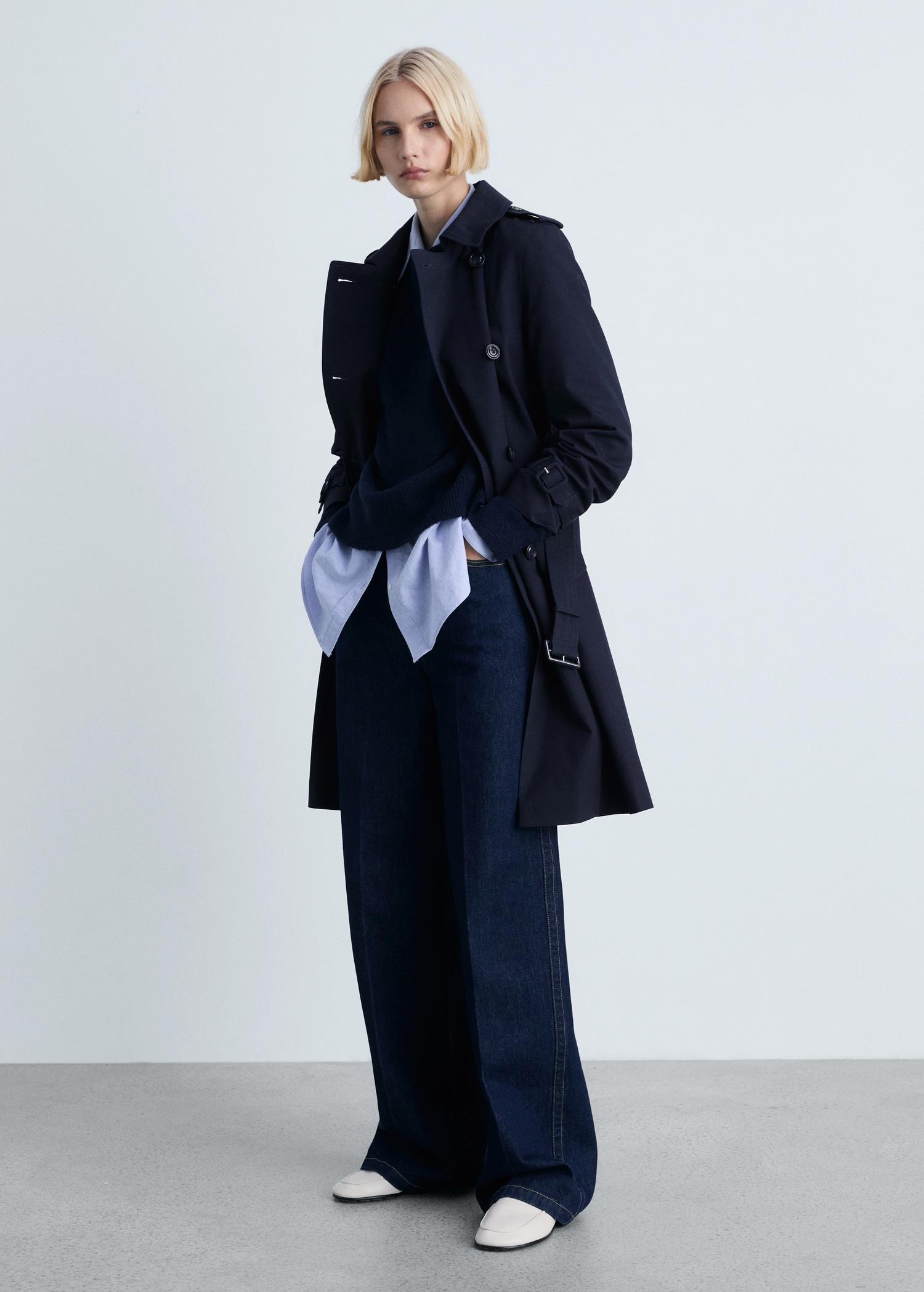100% cotton fabric. Straight design. Wrap design. Medium design. Lapel-collar. Long sleeves. Loops on the cuffs. Two side pockets. Front button closure. Adjustable belt. Back Slit at the Hem. Tortoiseshell effect buttons. Plus available. The dark blue color is an online exclusive. Water-repellent: The durable finish of this garment protects against light rain, repelling contact with water and raindrops. Exclusive Online