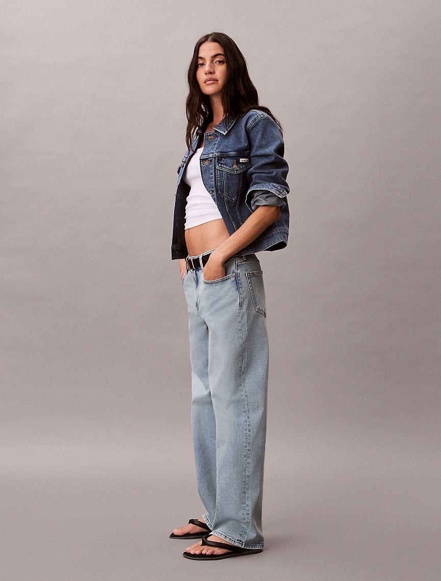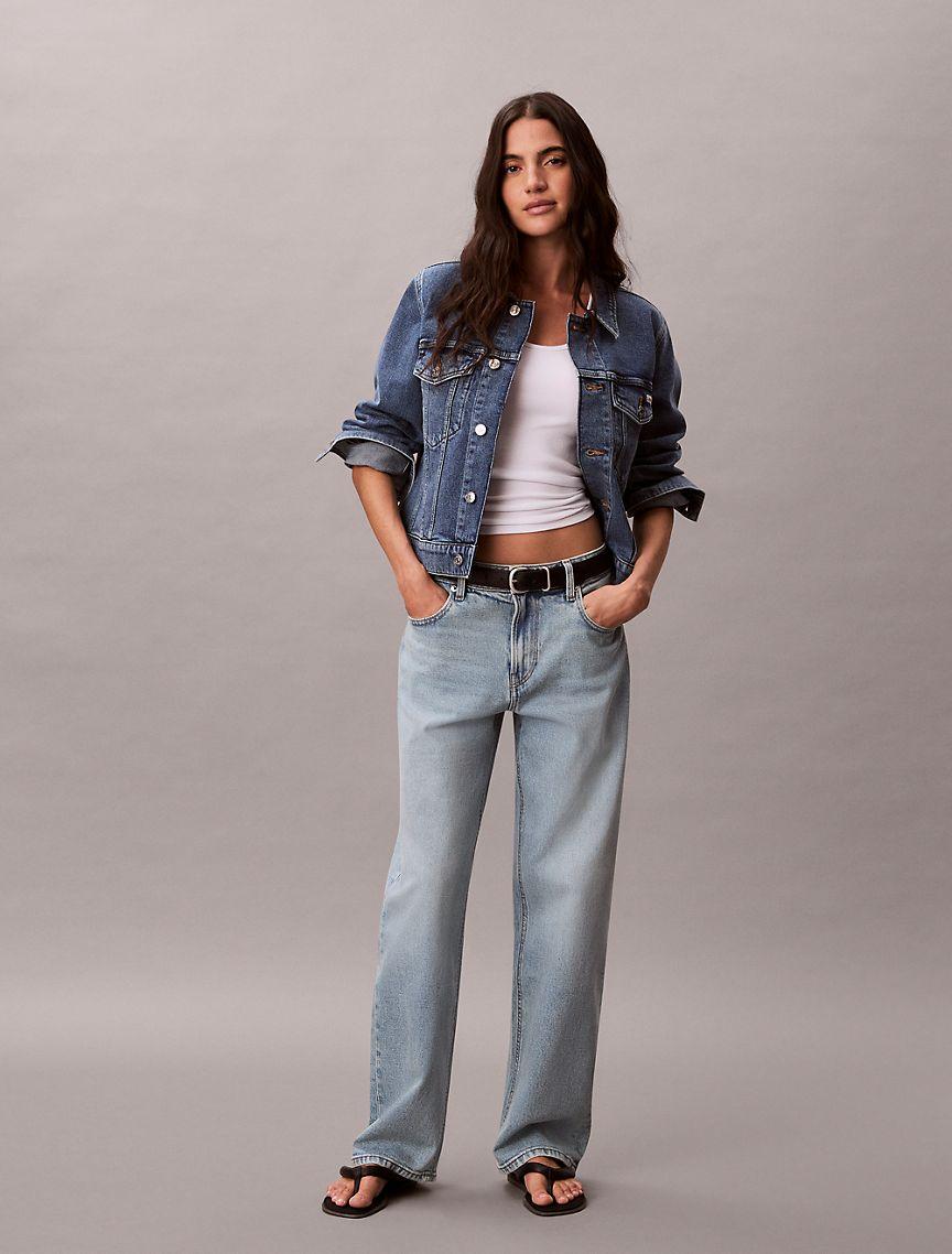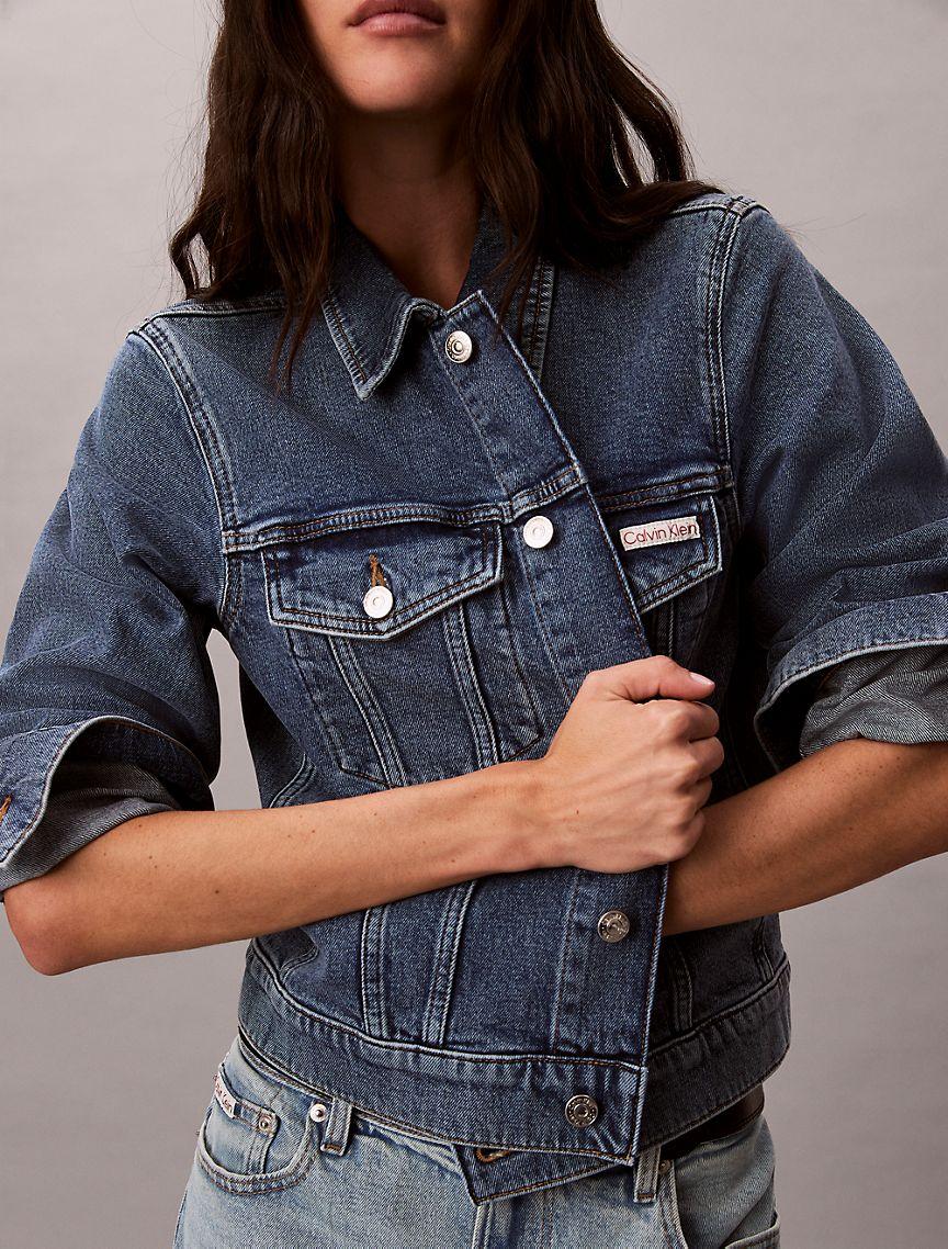 A classic icon and the foundation of a modern collection. This Calvin Klein trucker jacket is crafted from cotton stretch denim for a flexible design. Styled with metal logo hardware, an 80's inspired CK logo tag and an iconic monogram logo patch at the back waist.