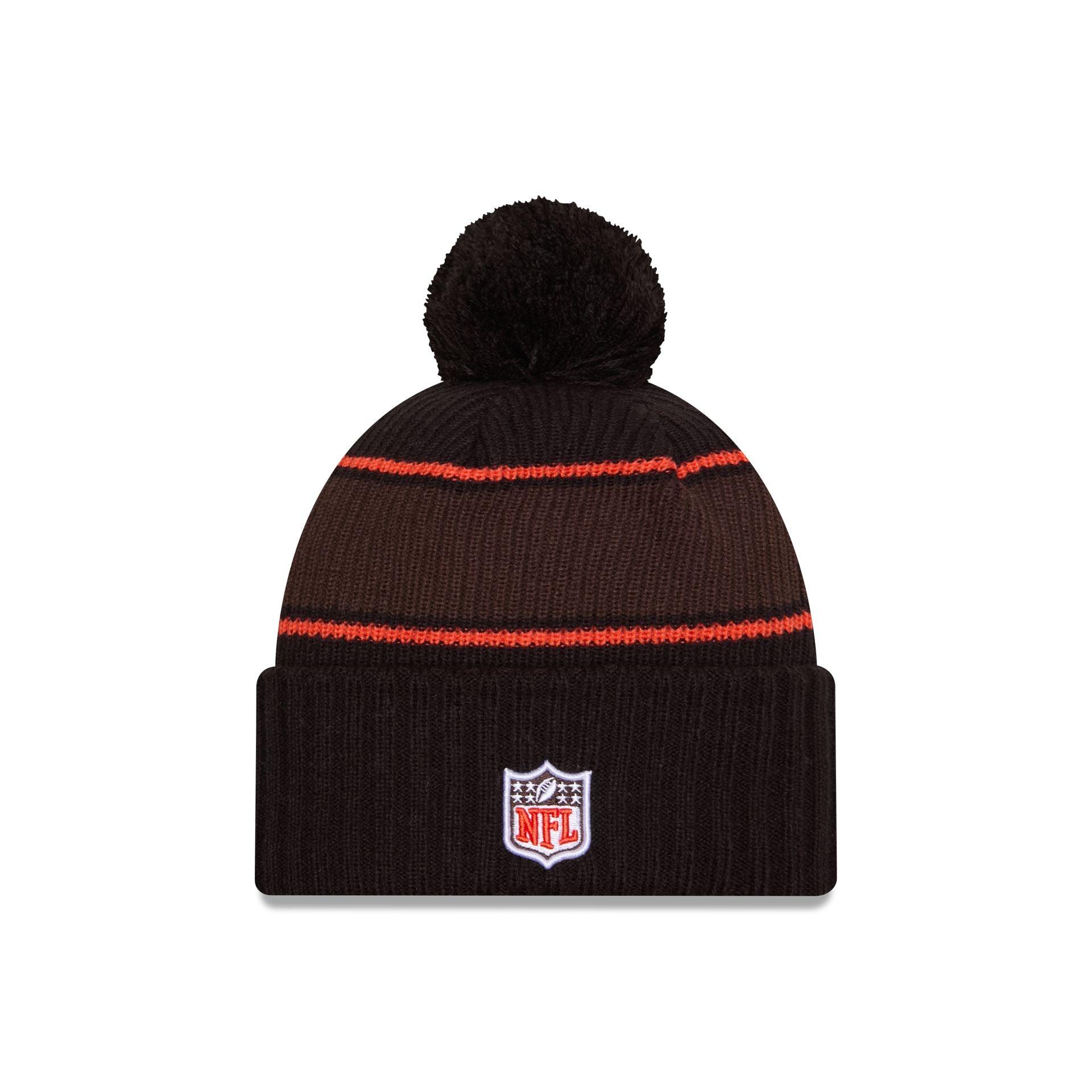 The New England Patriots 2024 Cold Weather Sport Pom Knit Hat features an embroidered Patriots logo at the front cuff with a matching NFL Shield at the rear. Additional details include a team wordmark at the crown and a one-time removable pom.