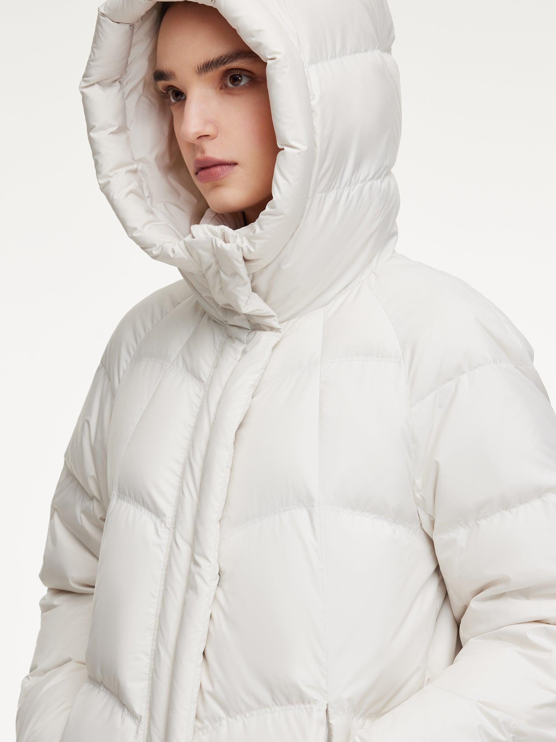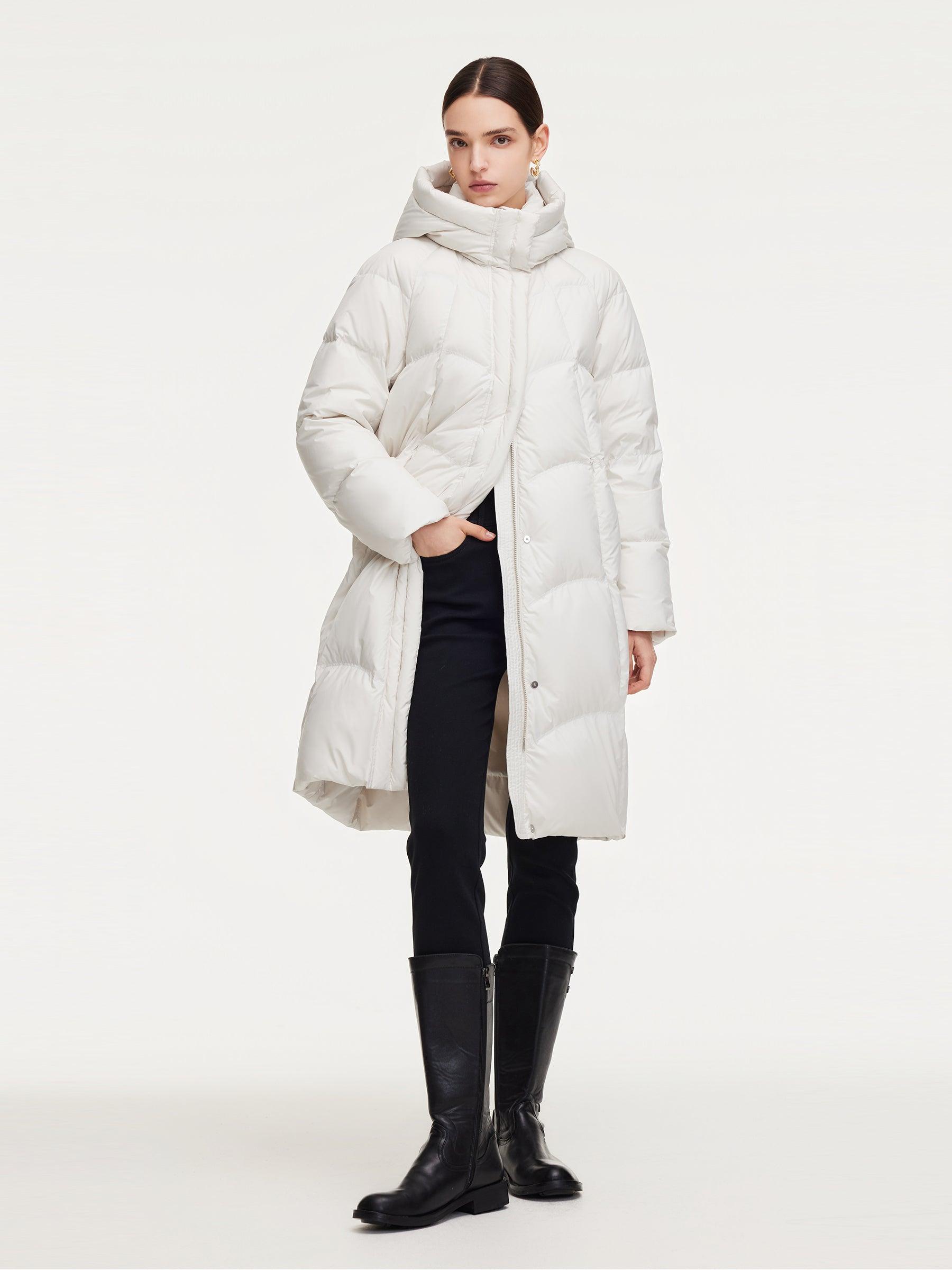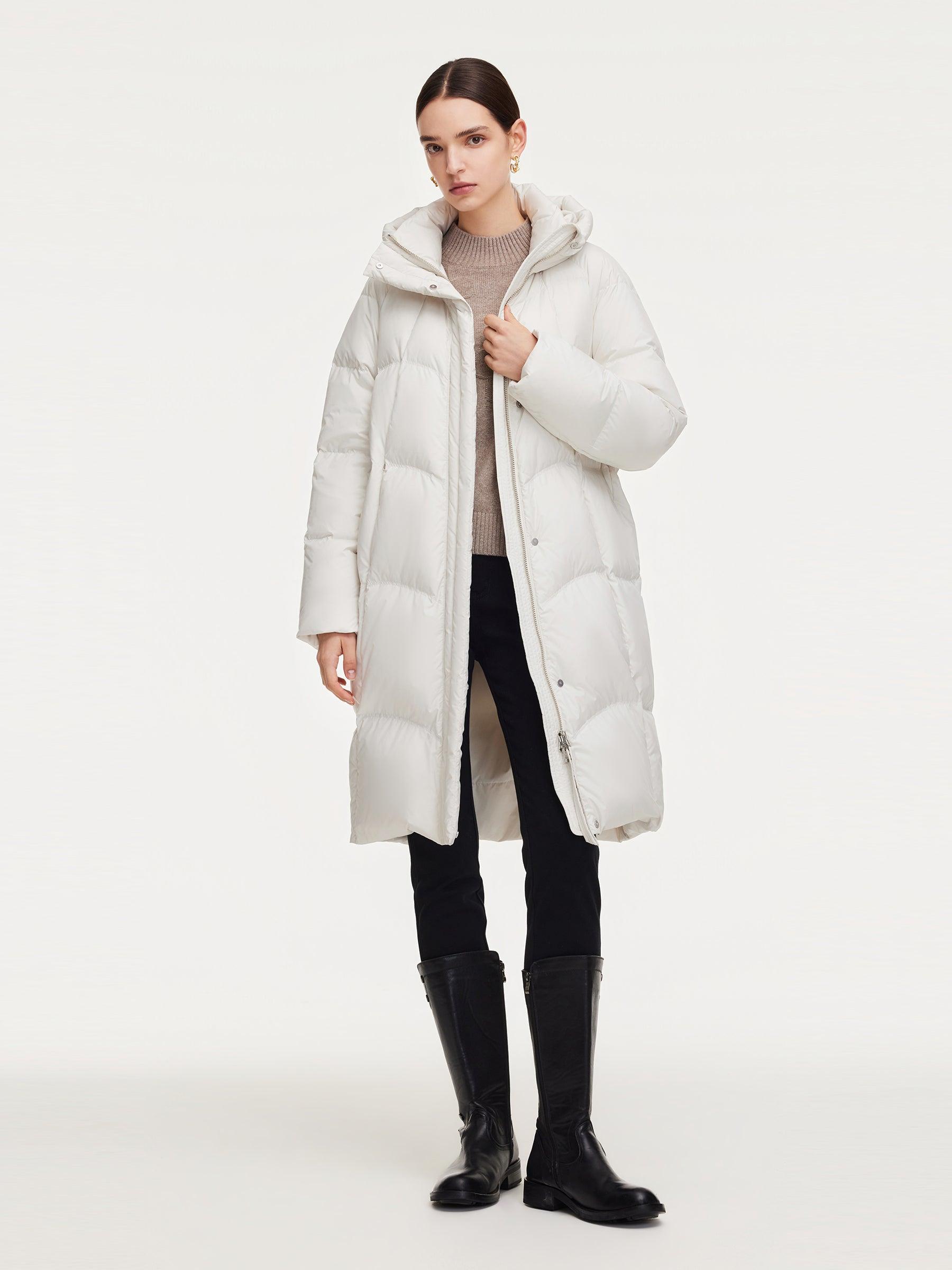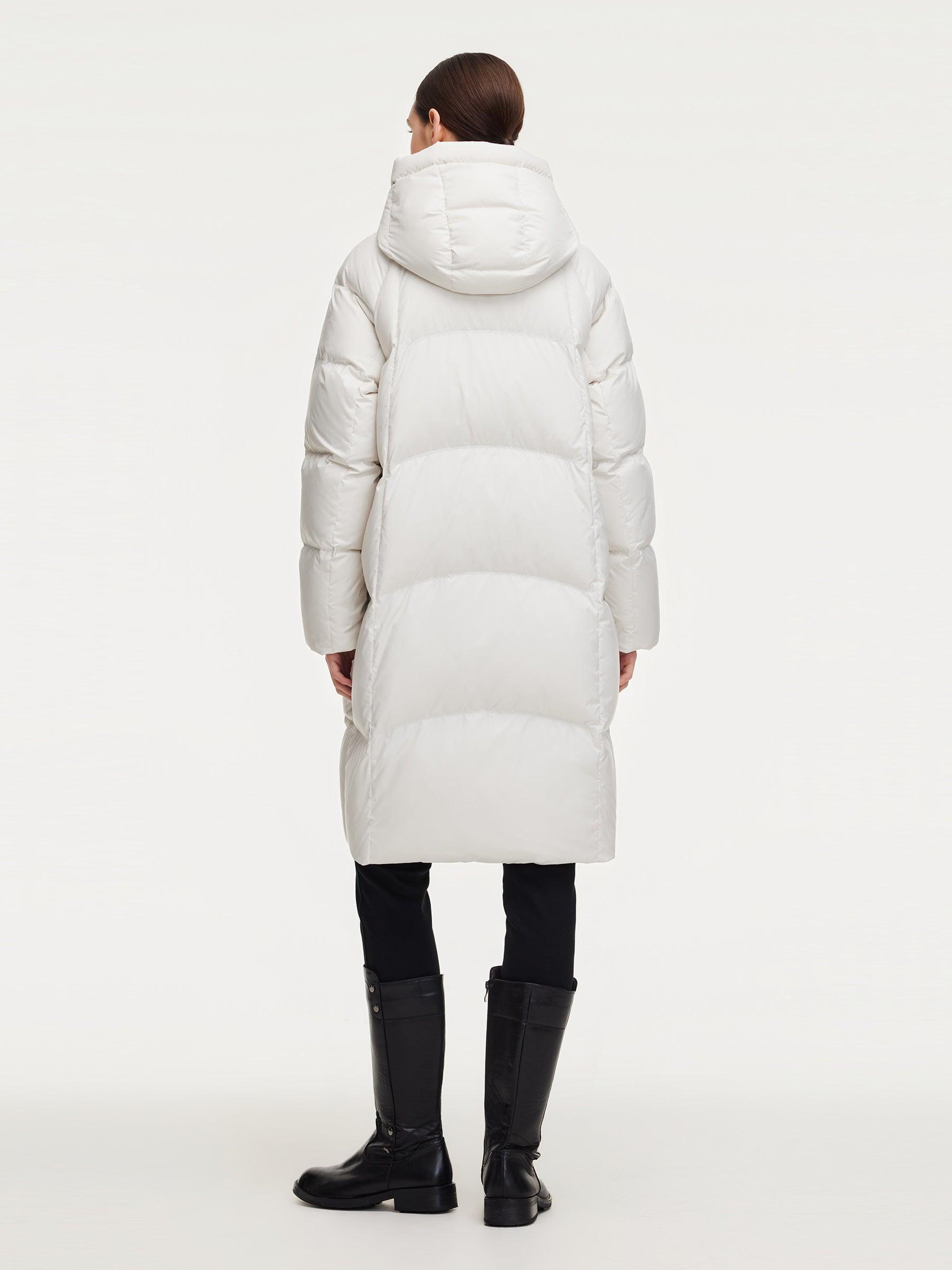 -95% down content and 90% down cluster content -With pockets -Warm This long goose down coat is filled with 95% premium Polish white goose down for exceptional warmth and breathability. The outer fabric features triple protection against water, oil, and stains, ensuring lasting comfort while effectively blocking moistu